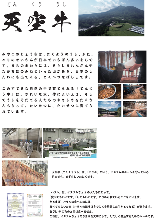 天空牛は、ただのハラール和牛ではありません。霧島山系の清浄な水と空気、丁寧な飼育管理により育った最高品質の和牛です。この味わいを通じて、多様性を尊重し合う社会の実現に貢献したいと考えています。