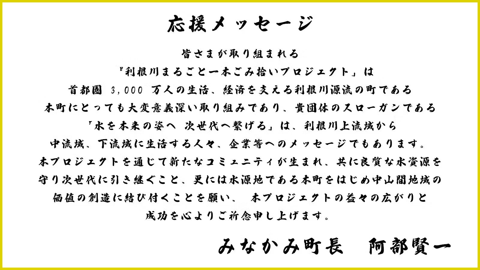 みなかみ町長阿部賢一様より、応援メッセージをいただきました。