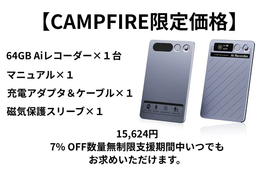この革新的なAIレコーダーをいち早く手にしていただくため、CAMPFIRE限定の特別なリターンをご用意しました。