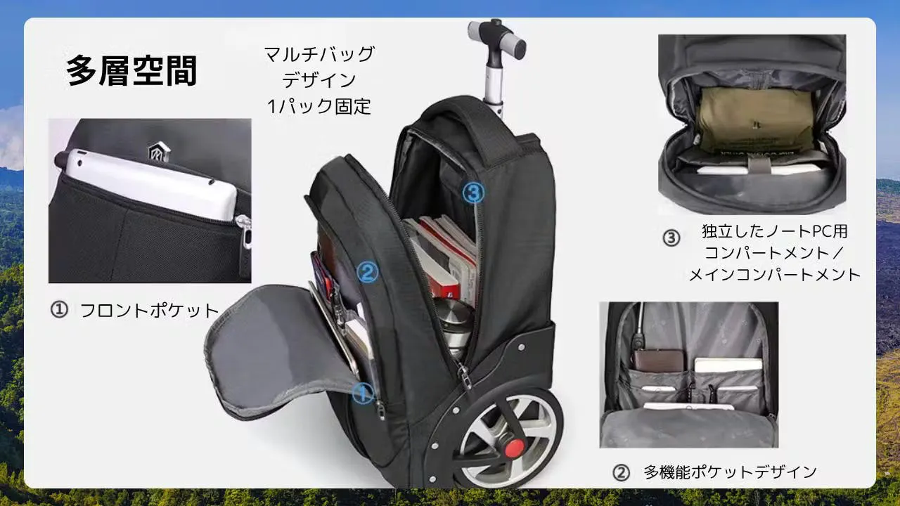 また、収納容量が豊富な大型設計を採用しており、35cm x 20cm x 48cm(18インチ)のコンパクトサイズでありながら、日常の必需品から旅行用の大きめのアイテムまで、しっかり収納可能。耐久性のあるオックスフォード素材を使用しているので、どんな過酷な環境にも強く、長期間安心して使い続けられます。