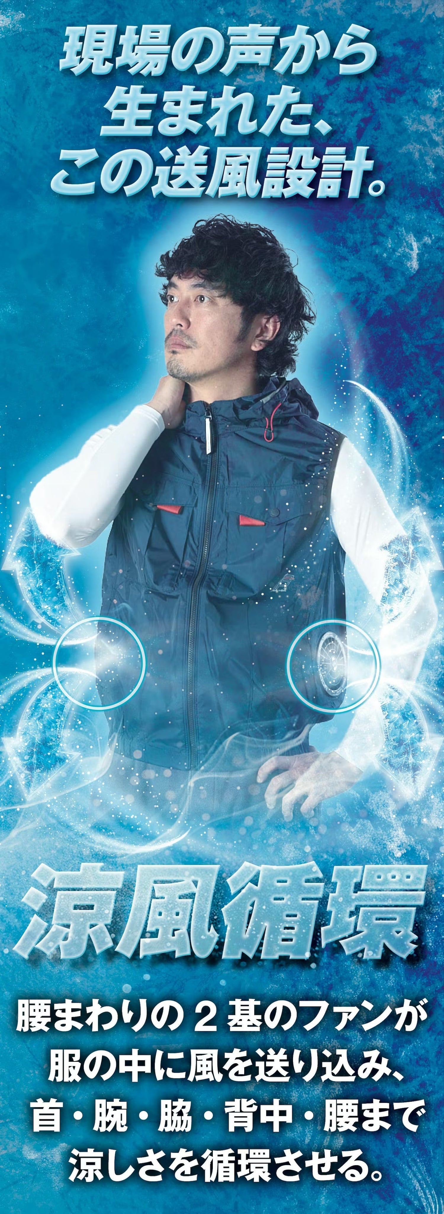 30Vのハイパワー ファンで、服の中に風の通り道をつくる。首・背中・脇・腰まで効率よく涼しくする“ファン送風式”冷感ワークウェアです。