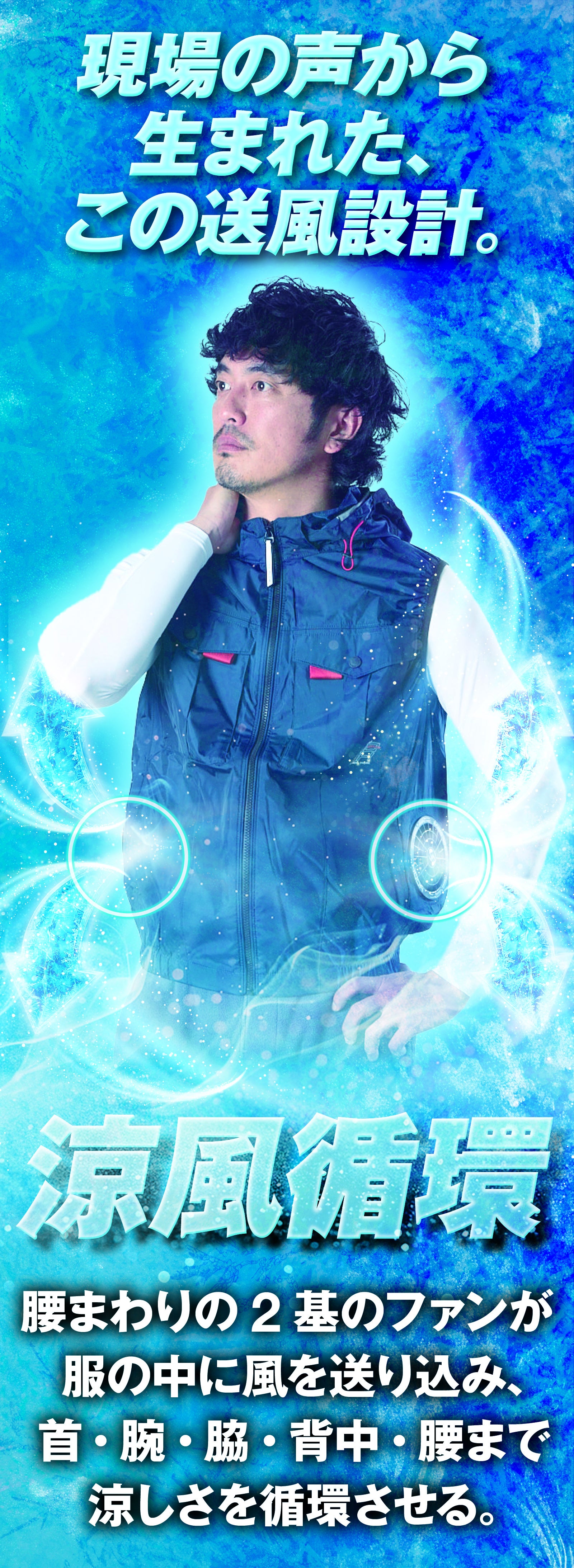 30Vのハイパワー ファンで、服の中に風の通り道をつくる。首・背中・脇・腰まで効率よく涼しくする“ファン送風式”冷感ワークウェアです。