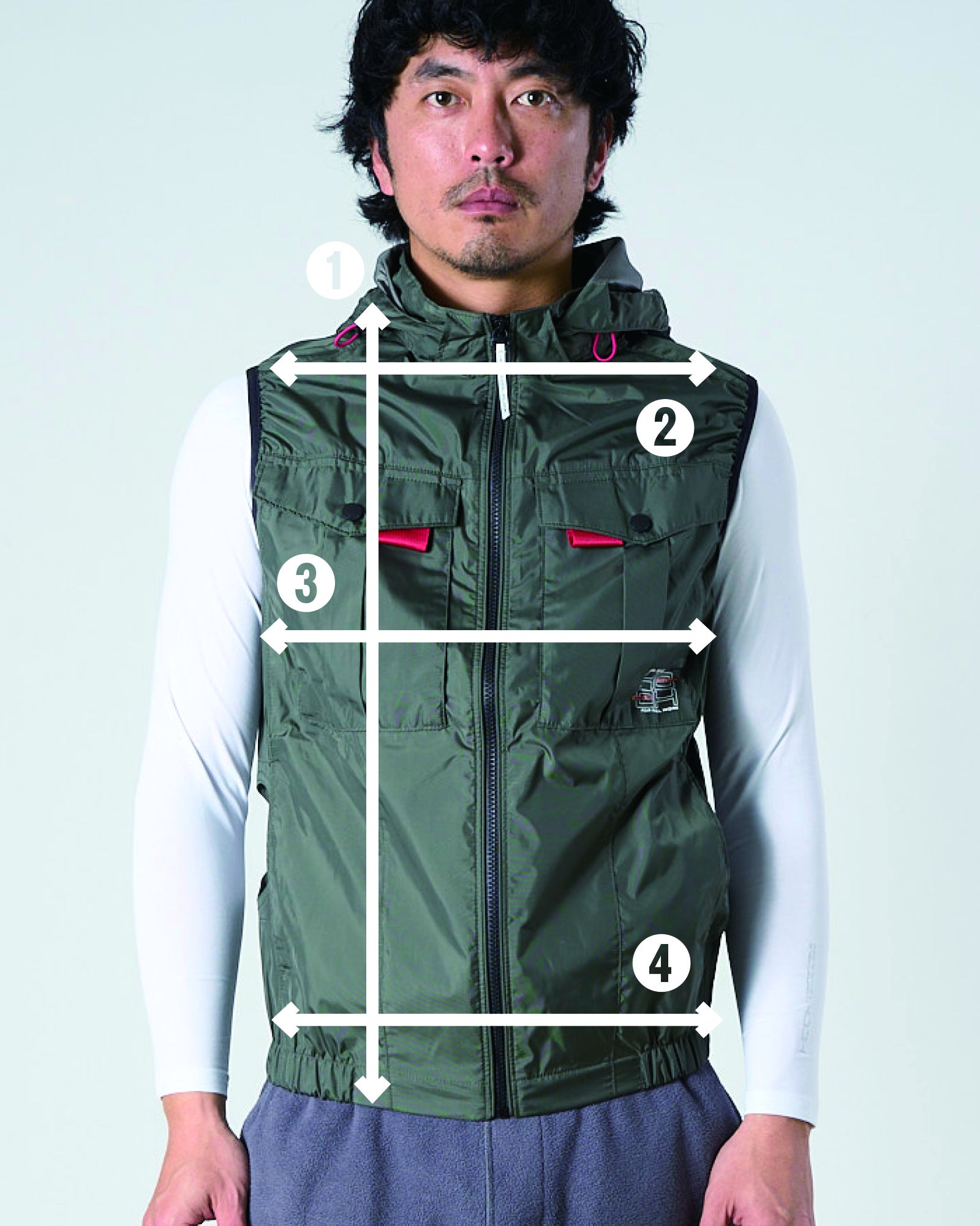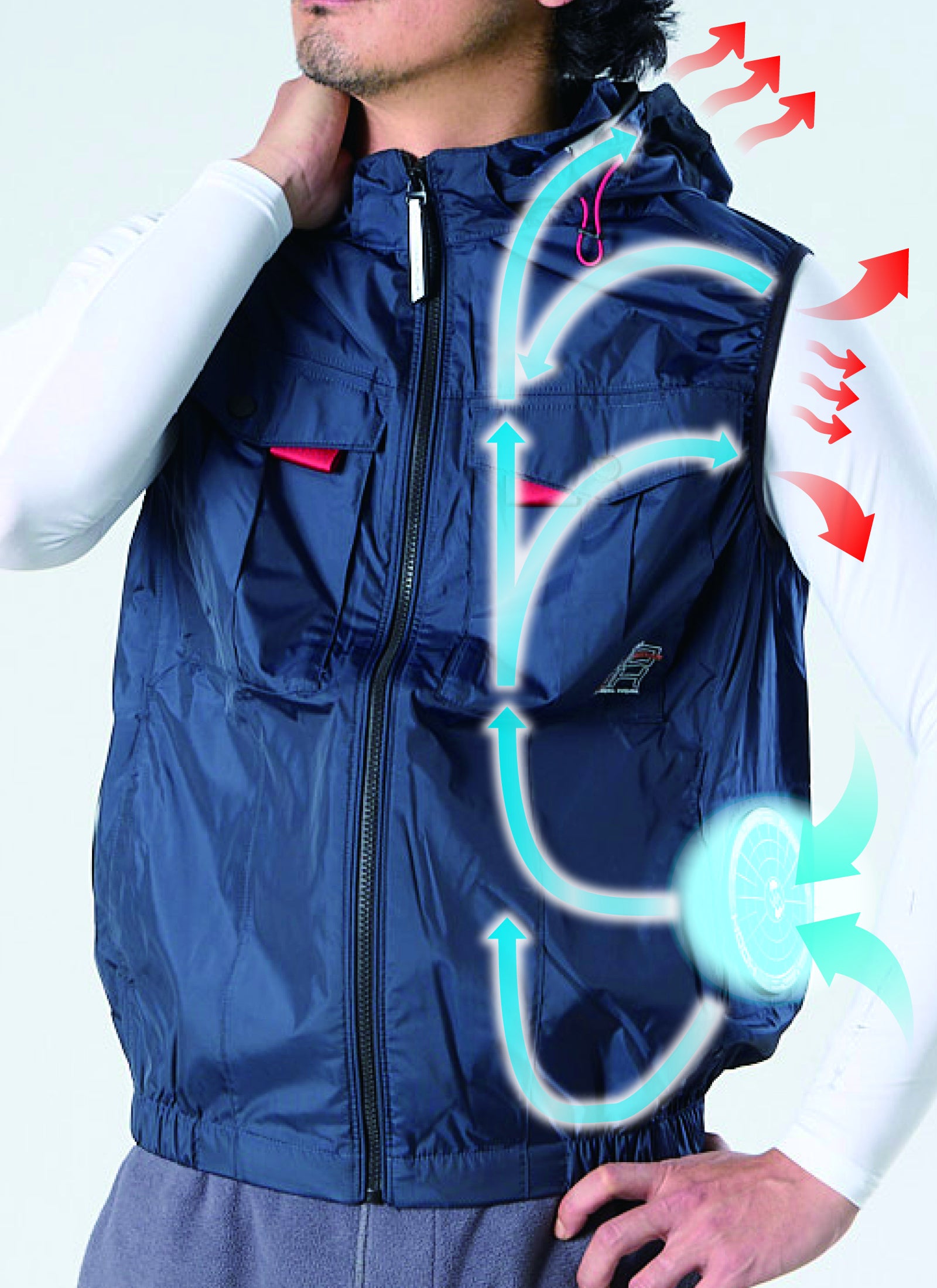 搭載されたファンが外気を取り込み、衣服内に風を送り込み、循環させます。