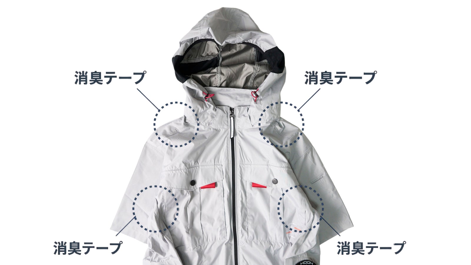 首元や脇など、汗をかきやすい部分には消臭テープを配置。長時間の作業や着用時でも、ニオイが気になりにくい設計です。