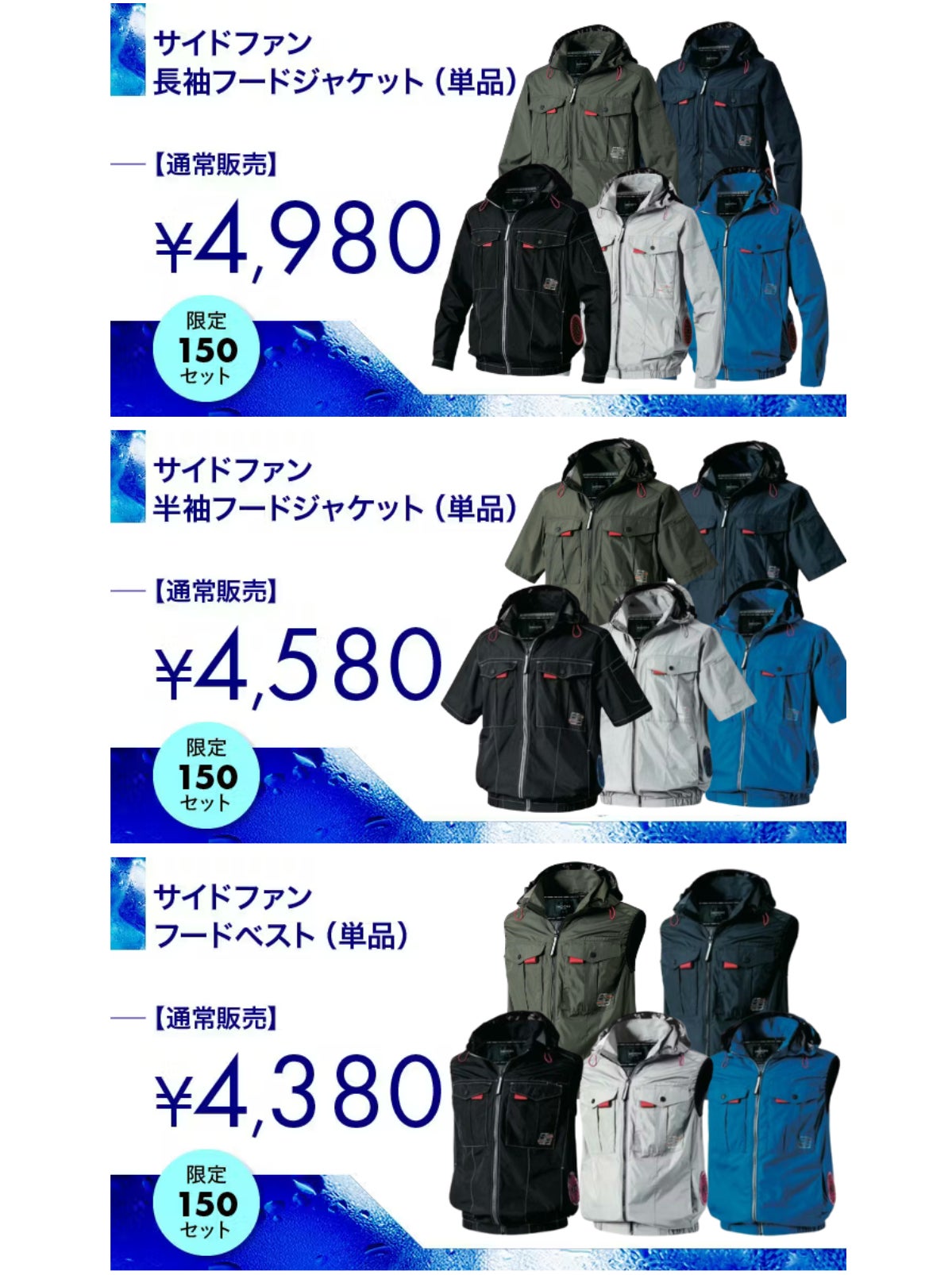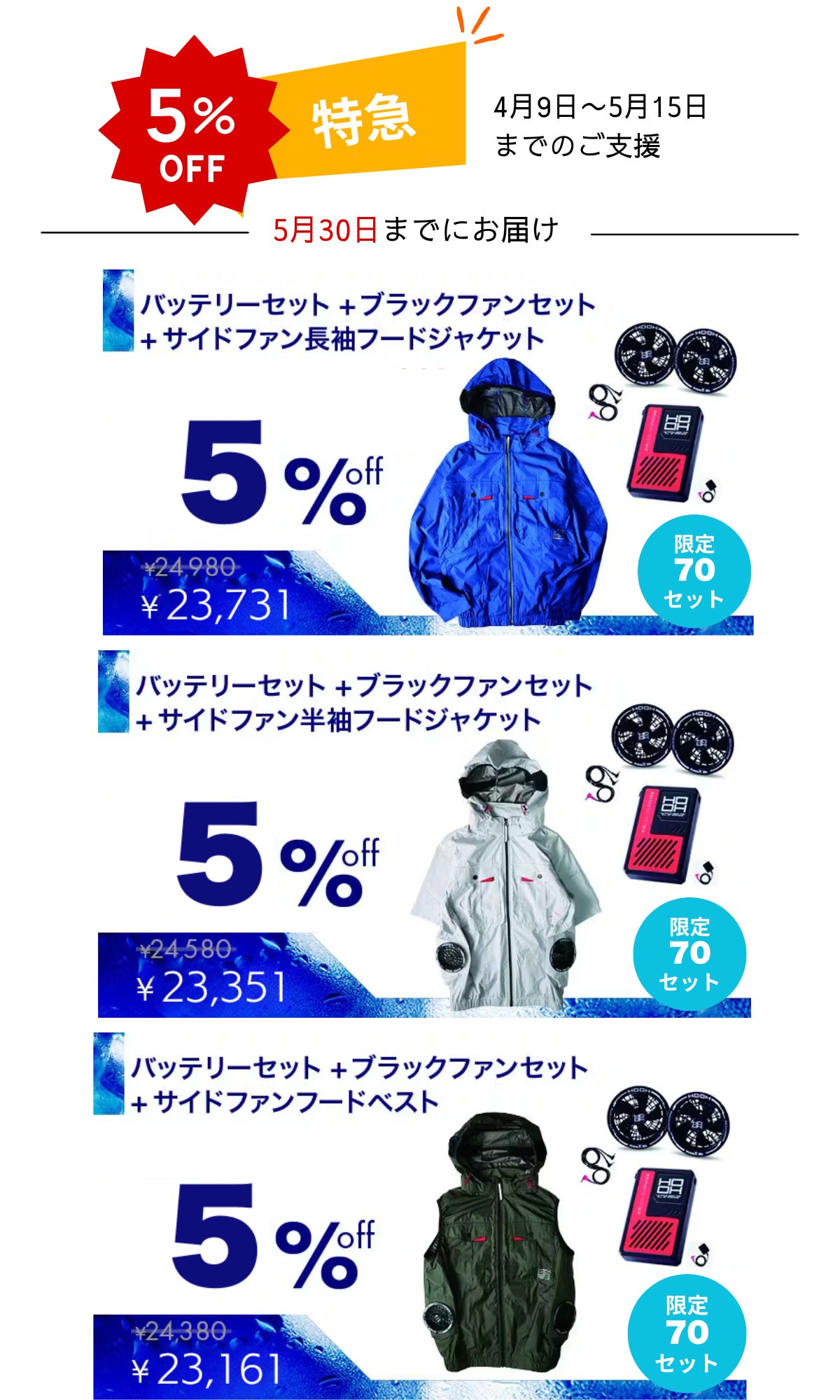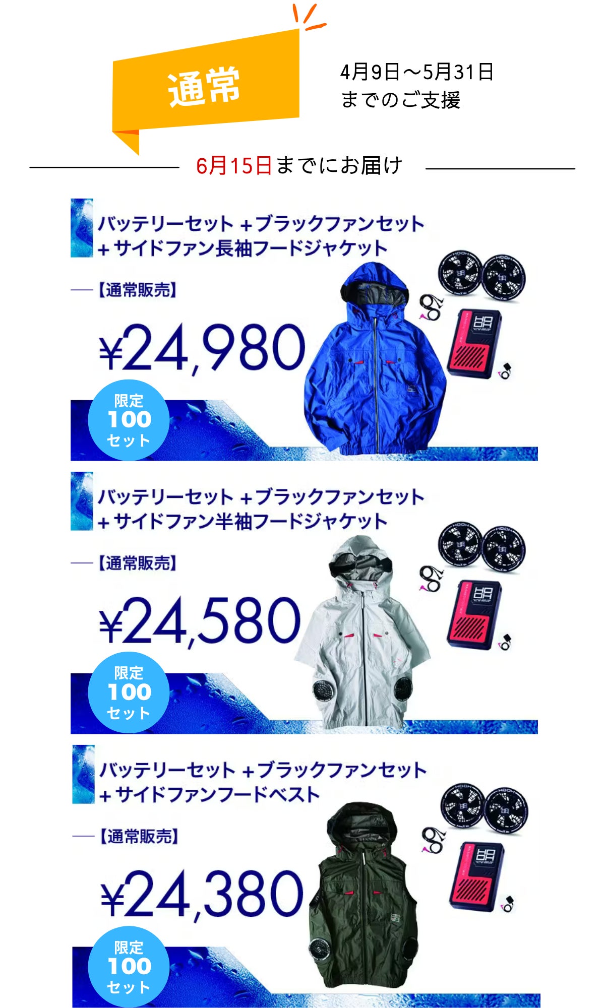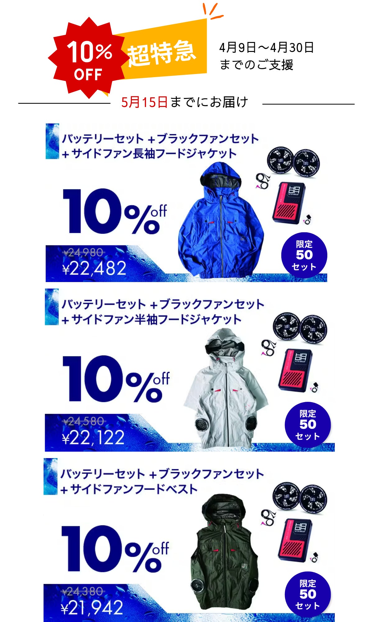 2026/04/09 09:54「最初の一歩」となるご支援をいただき、心より感謝申し上げます!まだスタートしたばかりですが、この30Vが放つ圧倒的な「爆風」と「涼しさ」を一人でも多くの方に届けられるよう、全力で走り抜けます。■ 早期支援のメリットをチェック!【超特急10%OFF】一番お得な条件で手に入ります。【5月15日までにお届け】本格的な暑さが始まる前にお手元へ。【半袖タイプに注目】使い勝手の良い半袖は特に人気が集中する見込みです。在庫には限りがございますので、この夏の熱中症対策を本気で考えている方は、ぜひお早めにチェックをお願いいたします!引き続き、応援よろしくお願いいたします! もっと見る
