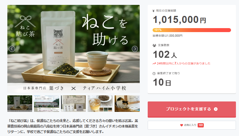 「ねこ結び茶」をリターンとした保護猫支援プロジェクト。