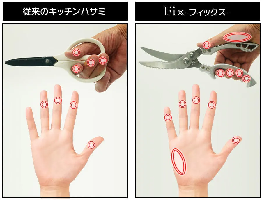 従来のキッチンハサミを使用する際、「親指、人差し指、中指、薬指」の4本のチカラが力点に加わっているのに対し、Fix-フィックス-を使用する場合、「親指、人差し指、中指、薬指、小指」の【5本】に加え、手の平の「母指球(ぼしきゅう)」部分のチカラを力点に加えているので、より強いチカラが作用点に加わっているのがわかるかと思います。