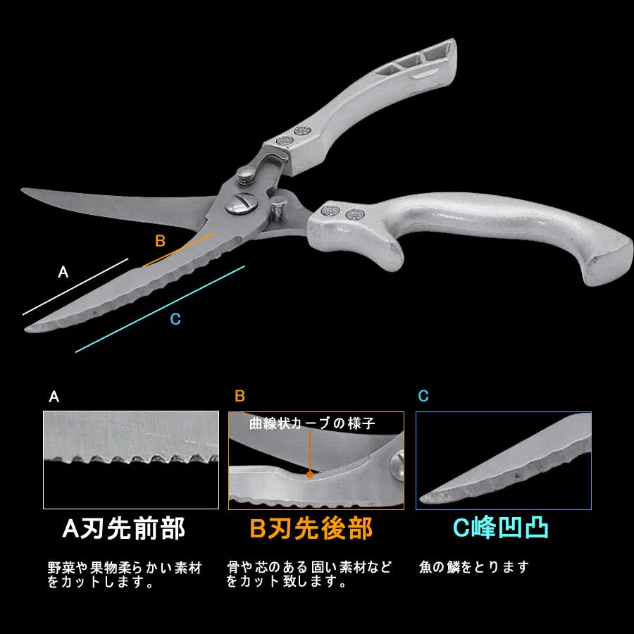 チカラが弱い女性の場合は、刃の奥の付け根部分に肉を骨ごと挟んで「(※注意)下のグリップ部を床に付けて上から体重をかけて押し切る」と骨まで切断することができるはずです。皮の部分は、ハサミの先端を利用して切ってください。
