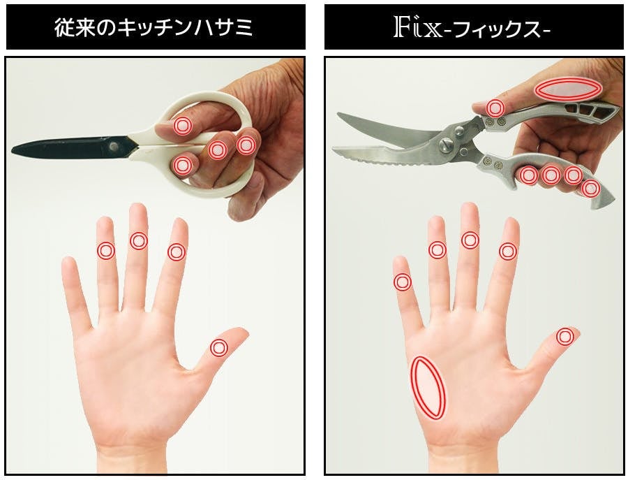 従来のキッチンハサミを使用する際、「親指、人差し指、中指、薬指」の4本のチカラが力点に加わっているのに対し、Fix-フィックス-を使用する場合、「親指、人差し指、中指、薬指、小指」の【5本】に加え、手の平の「母指球(ぼしきゅう)」部分のチカラを力点に加えているので、より強いチカラが作用点に加わっているのがわかるかと思います。