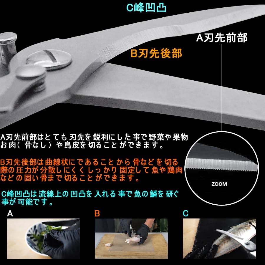 包丁、骨斬り包丁、鱗とり器など各それぞれが世の中に出回っている中「Fix-フィックス-」1台でこの3役を賄える上に、ハサミとして上記機能を備えている事からお子様のお料理練習や高齢者様、手に障害をお持ちの方でも安全にお使い頂け、幅広いお料理に挑戦する事が可能になります