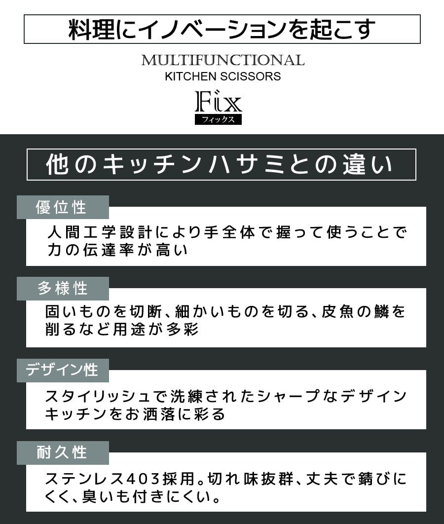 包丁、骨斬り包丁、鱗とり器など各それぞれが世の中に出回っている中「Fix-フィックス-」1台でこの3役を賄える上に、ハサミとして上記機能を備えている事からお子様のお料理練習や高齢者様、手に障害をお持ちの方でも安全にお使い頂け、幅広いお料理に挑戦する事が可能になります