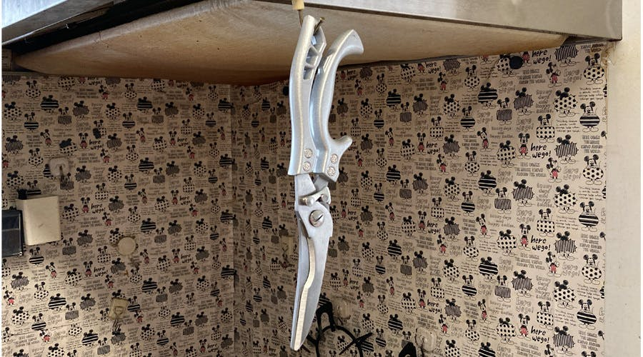 チカラが弱い女性の場合は、刃の奥の付け根部分に肉を骨ごと挟んで「(※注意)下のグリップ部を床に付けて上から体重をかけて押し切る」と骨まで切断することができるはずです。皮の部分は、ハサミの先端を利用して切ってください。