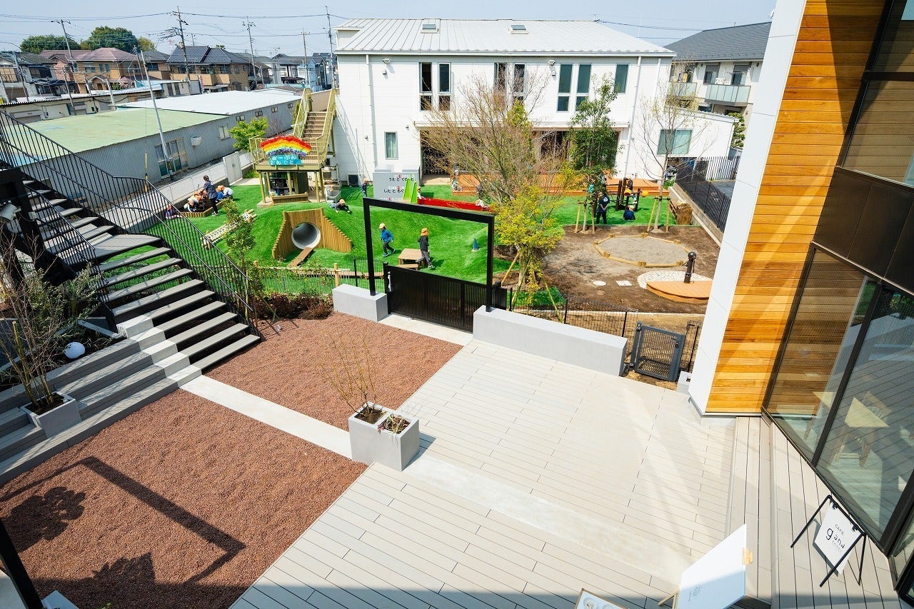 施設2階から見える中庭と保育園元気キッズ新座池田園の園庭