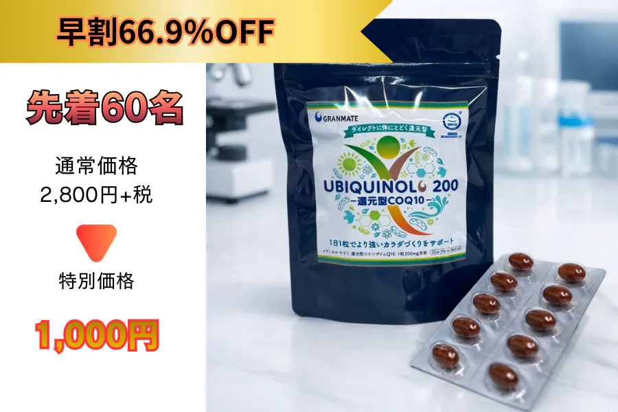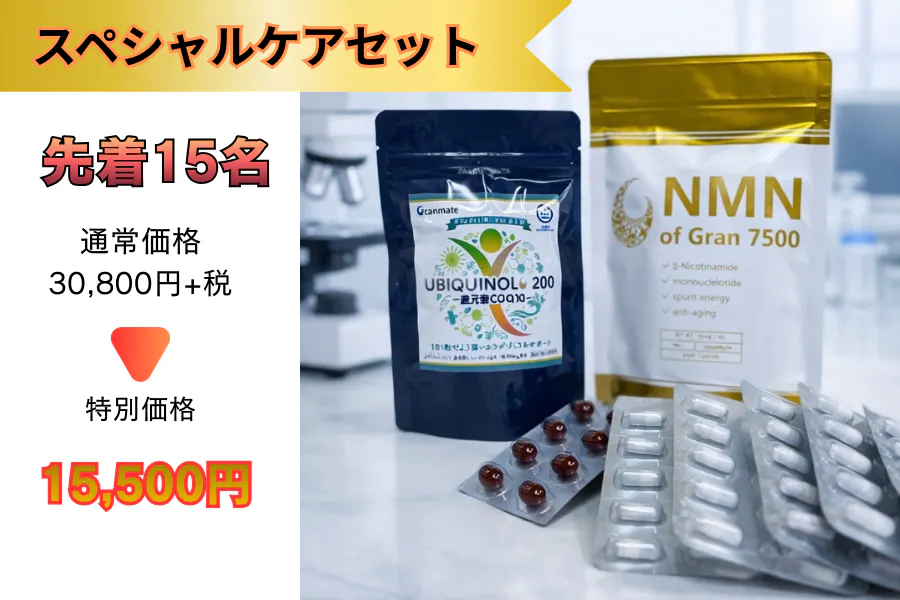 ■新発売「ユビキノール・還元型コエンザイムQ10(200mg)」10日分/通常〔¥2,800+税〕 + NMN of Gran 7500(125mg×60カプセル)/通常〔¥28,000+税〕
