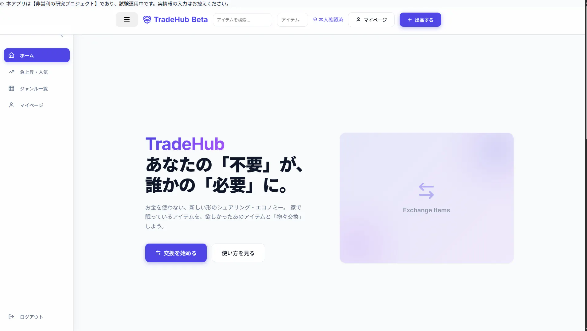 物価高で新品を買うことが難しい時代に,「家にある不用品」が「誰かの宝物」と直接つながる拠点(Hub)を作ることです.システム手数料を極限まで抑え,ユーザーの負担は実質「送料のみ」.