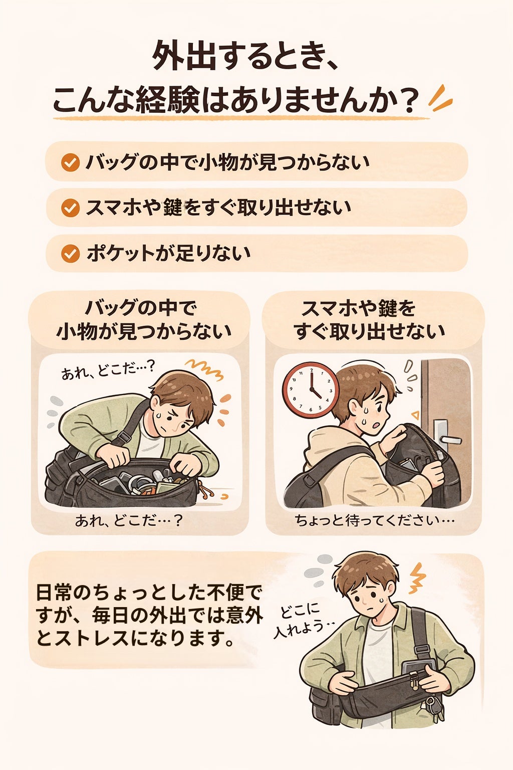 そんな日常の小さな不便を、少しでも快適にできたらと思い、この EDCミニショルダー を企画しました。