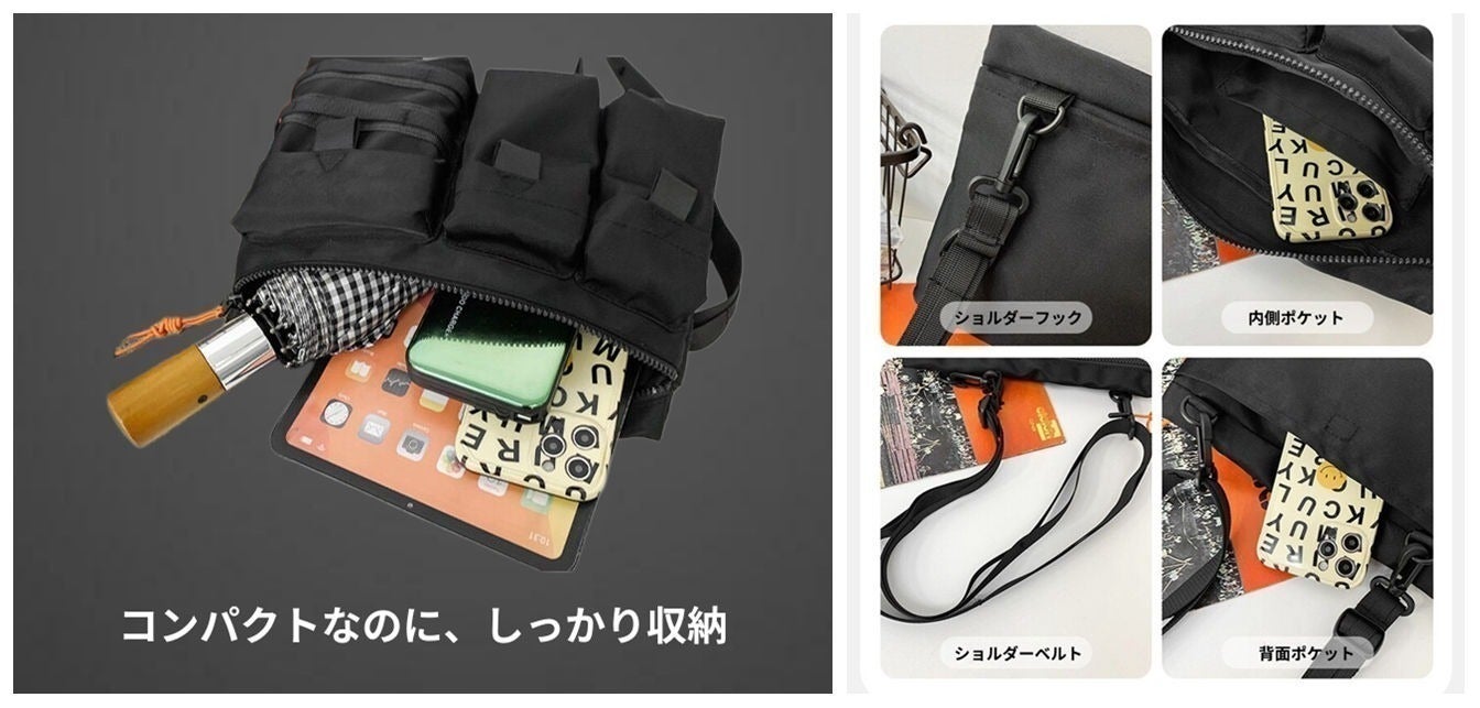 コンパクトながらスマホ・充電器・折りたたみ傘・iPadなどを収納可能。