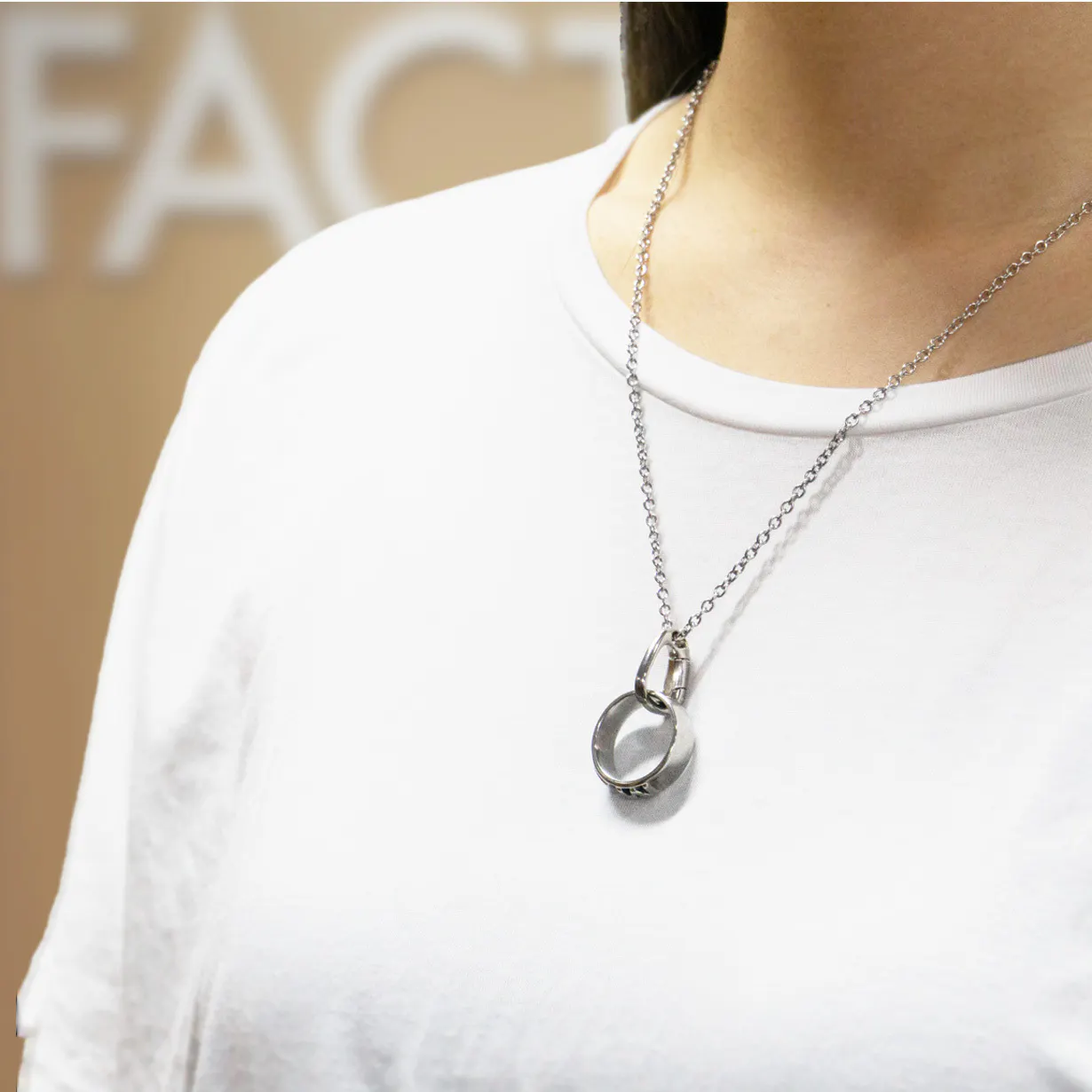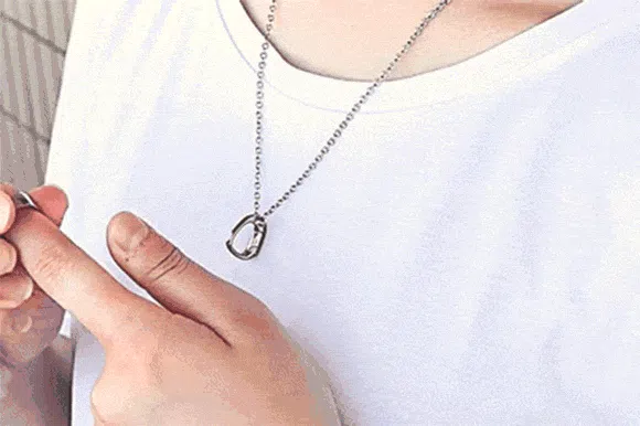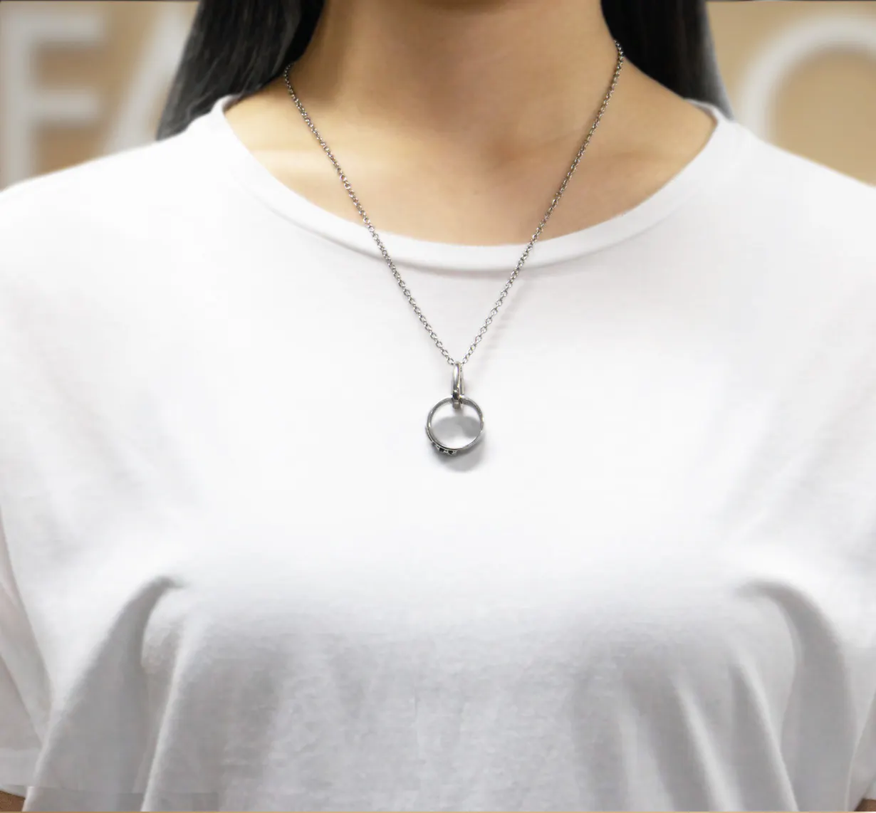 チェーンを首にかけたままリングの付け外しができます。