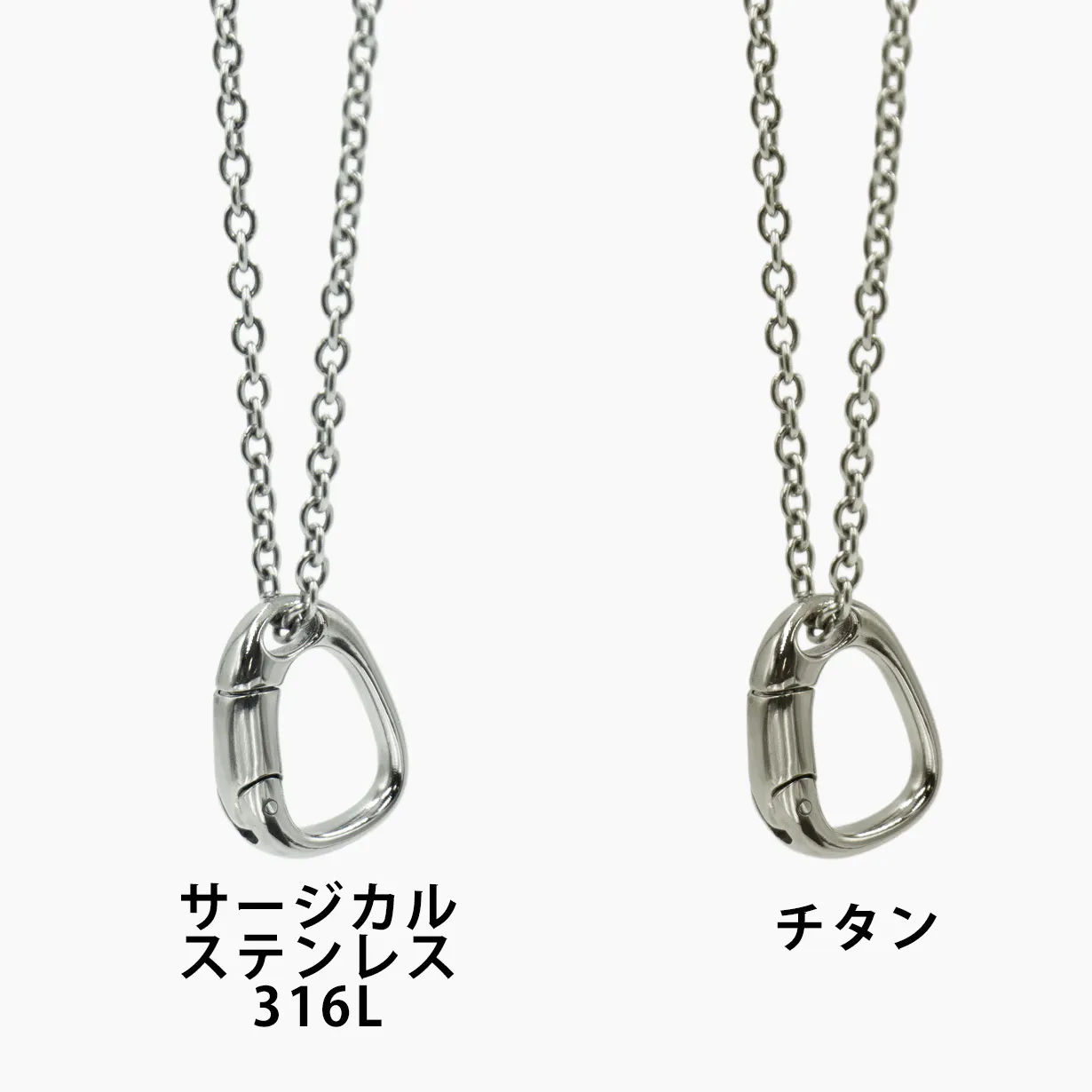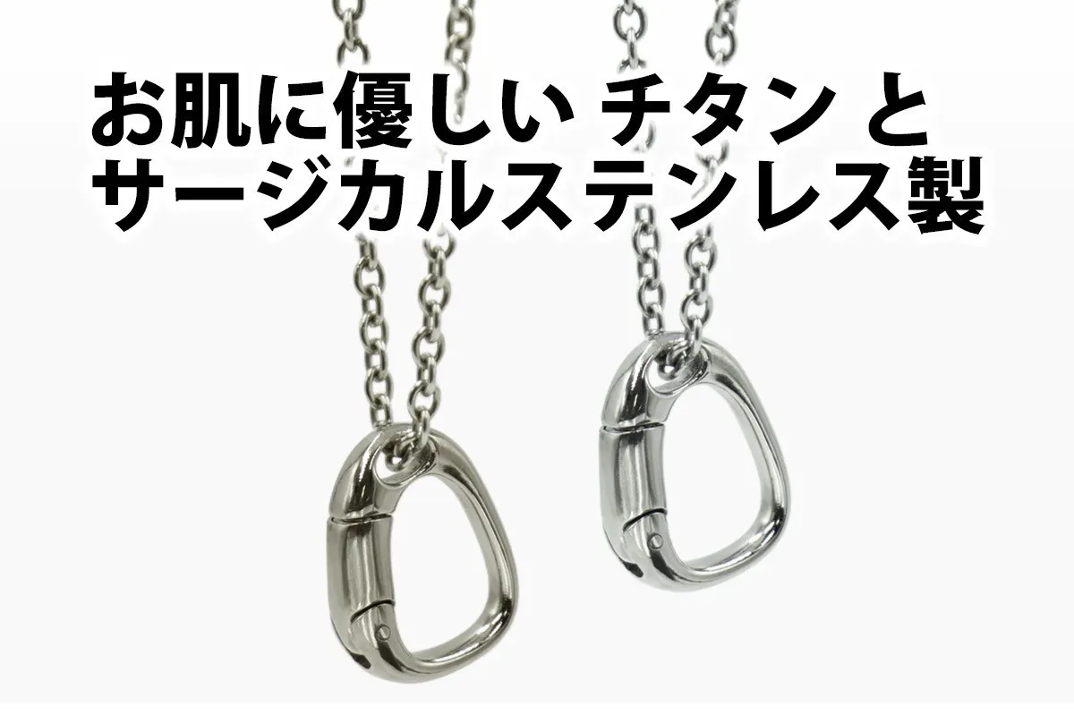 A:お肌に触れる部分は、チタンモデル・サージカルステンレスモデル共に、チェーンから金具まで全て同素材です。一部リングホルダーに極小のステンレス部品を使用しています。