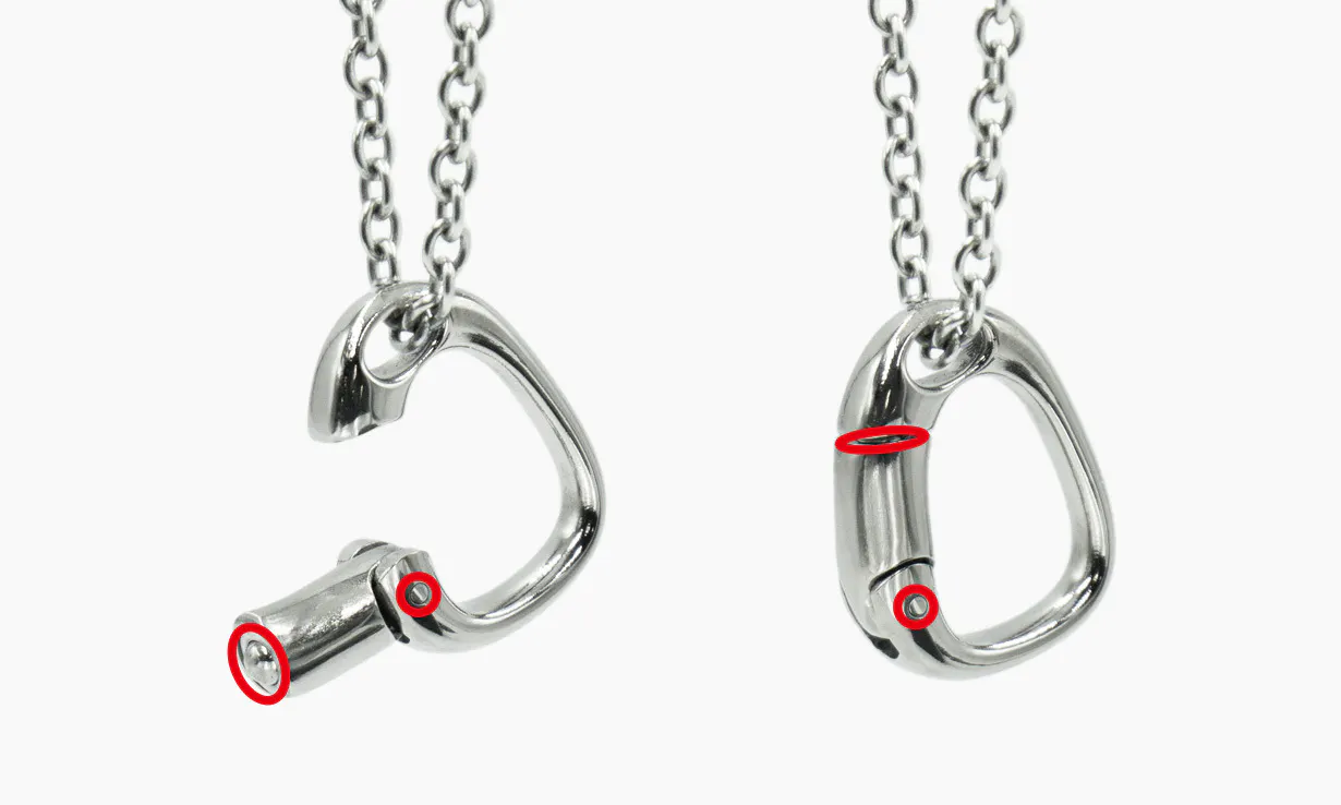 サージカルステンレス・チタンともに、赤丸の部分にステンレス素材の部品を使用しています。大変小さく、またお肌に触れにくい部分です。