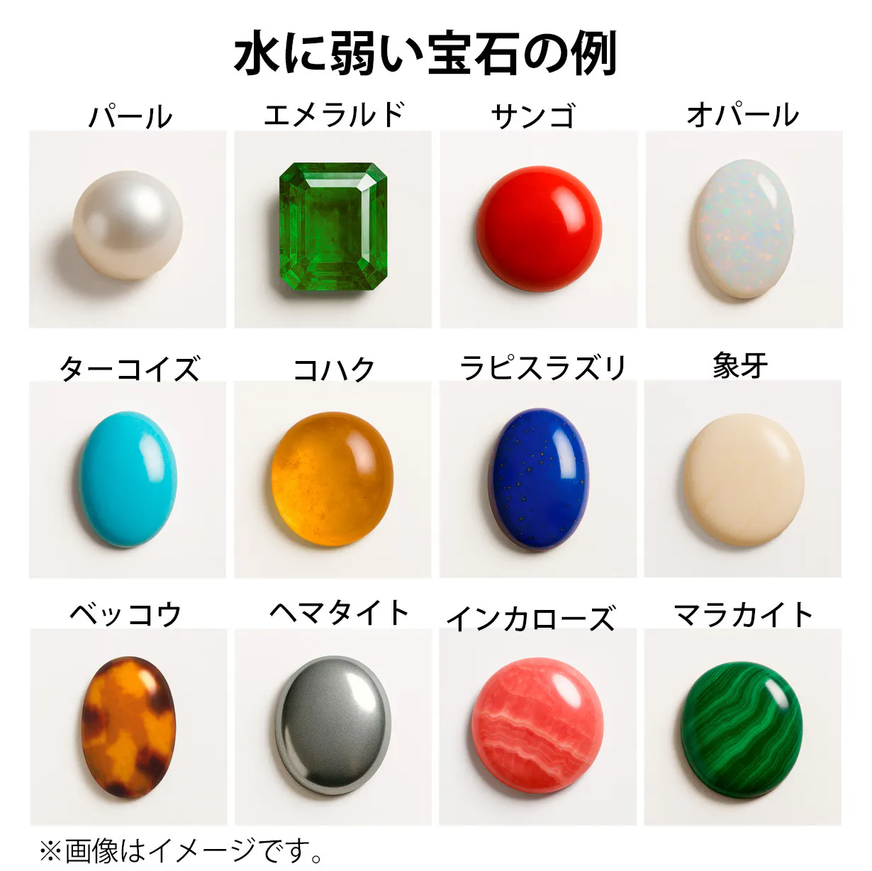 シルバー(銀)、パール(真珠)、エメラルド、サンゴ(コーラル)、オパール、ターコイズ(トルコ石)、コハク、ラピスラズリ、象牙(アイボリー)、ベッコウ、ヘマタイト、インカローズ、マラカイト等