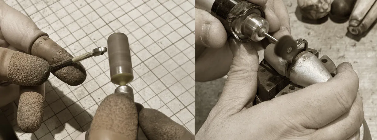 ジュエリーの一般的な製法であるキャスト製法(溶かした金属を型に流して作る鋳物)とは異なります。代表的な製品はエンジンパーツなどで、一つの部品に厚い部分と薄い部分があり、大変丈夫です。