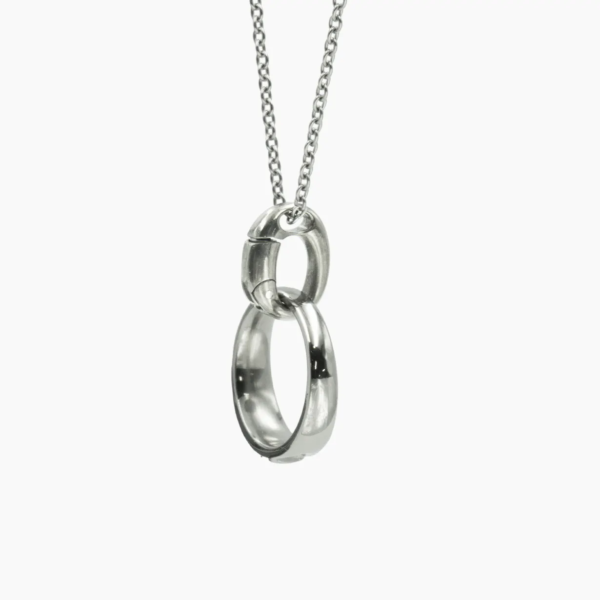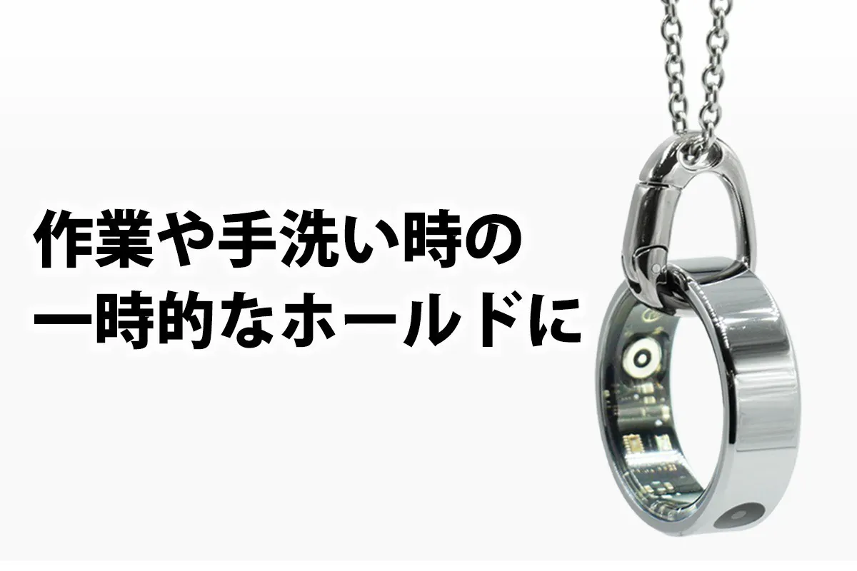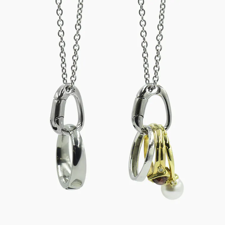 首にかけたままで手軽にカチッとリングを着脱。