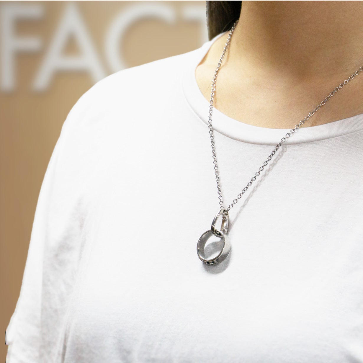 チェーンを首にかけたままリングの付け外しができます。