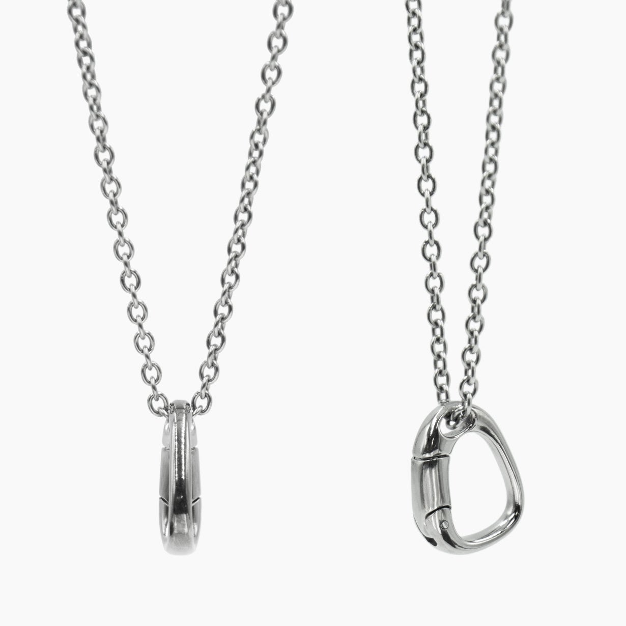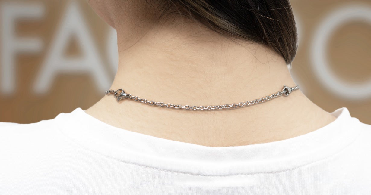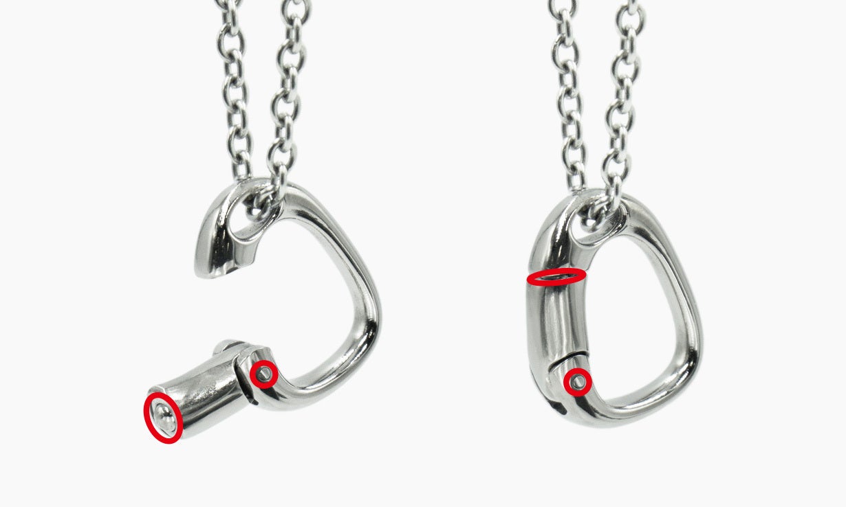 A:お肌に触れる部分は、チタンモデル・サージカルステンレスモデル共に、チェーンから金具まで全て同素材です。一部リングホルダーに極小のステンレス部品を使用しています。