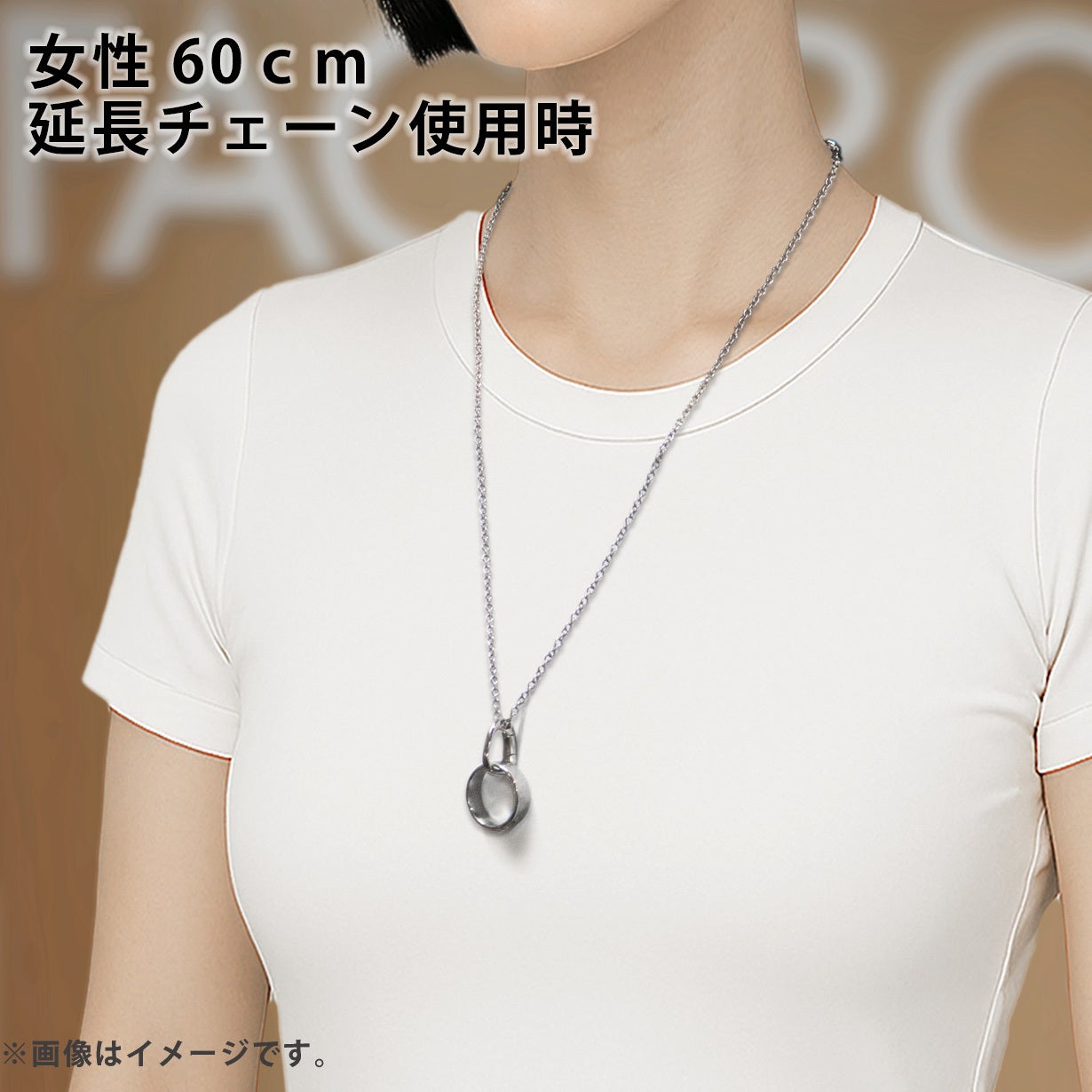 標準チェーン長さは50cm。オプションリターンの延長チェーンで10cm長さが伸ばせます。季節やファッションでご自分で長さを調節することもできます。