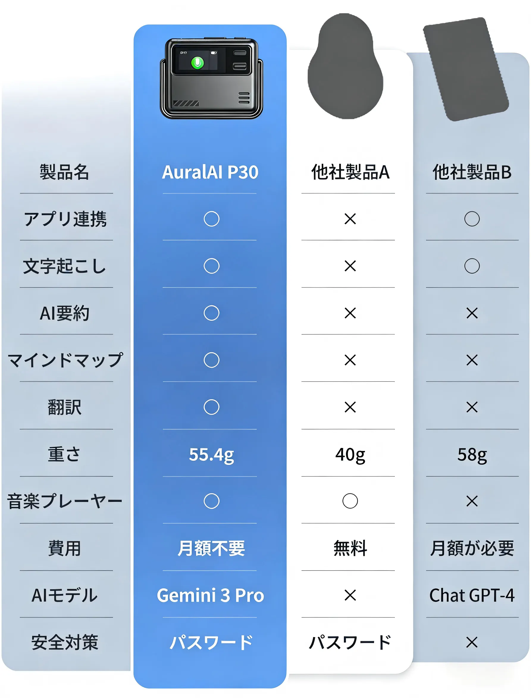 「AuralAI」はGemini 3 Pro連携で録音・文字起こし・翻訳・要約を一本化し、ビジネスから日常生活まであらゆるシーンで情報を効率的に管理してくれる次世代超コンパクトAIボイスレコーダーです。さらに、課金なしではAI機能が使えない今までのAIガジェットとは異なり、サブスクなしで無料で利用できるのが特徴!