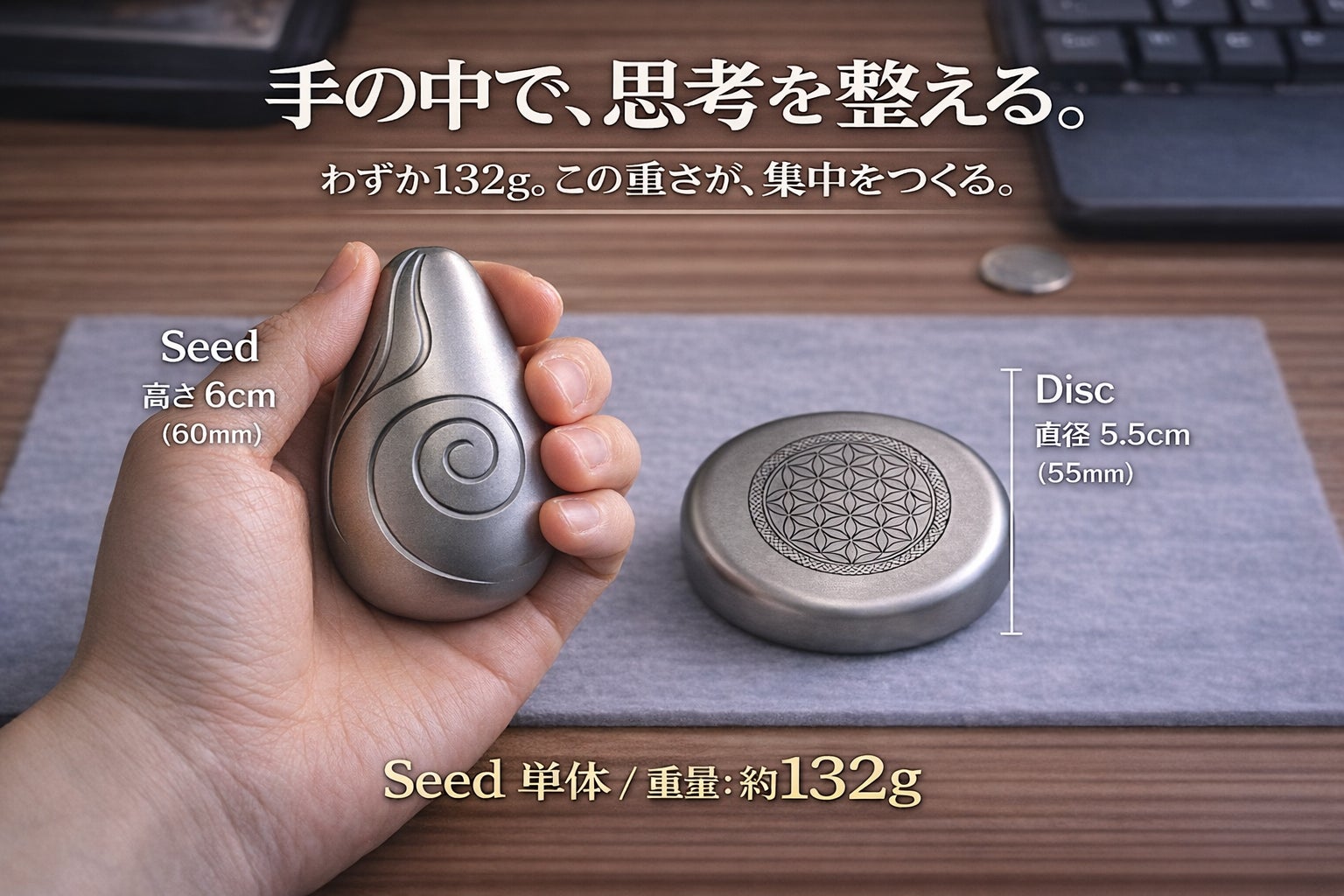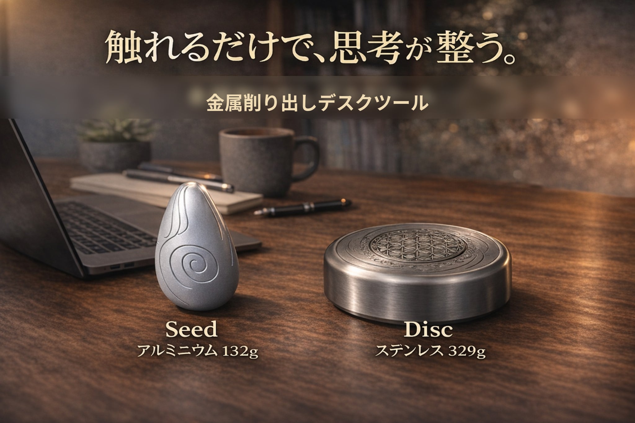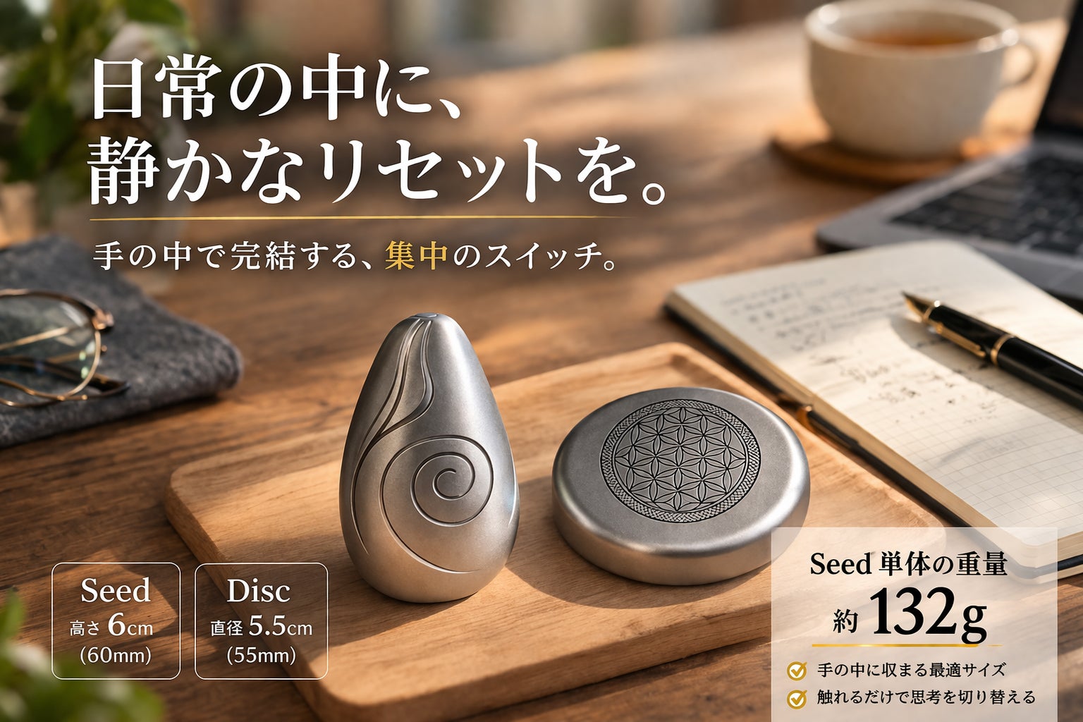 Meditation SeedとDiscは、単なるツールではなく、デスクアクセサリーやオブジェとしても楽しめます。金属削り出しならではの静かな存在感が、デスク空間を引き締め、美しく整えます。