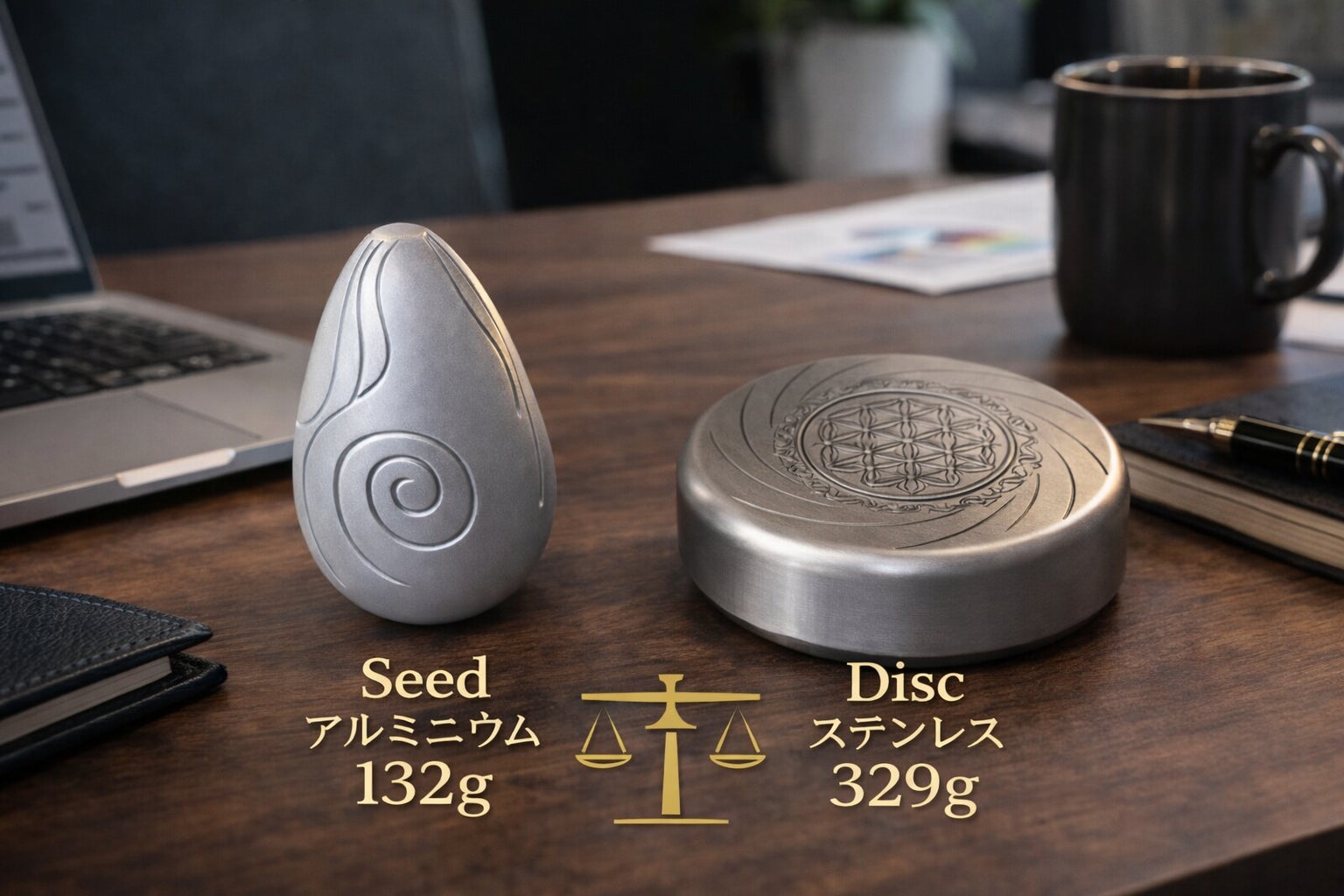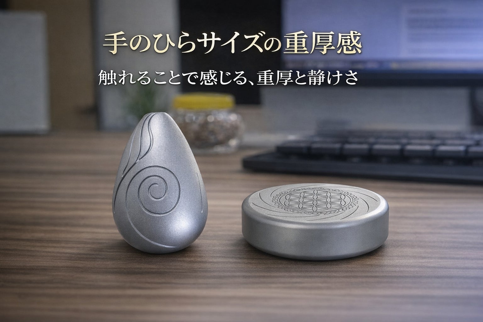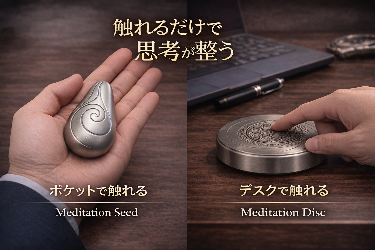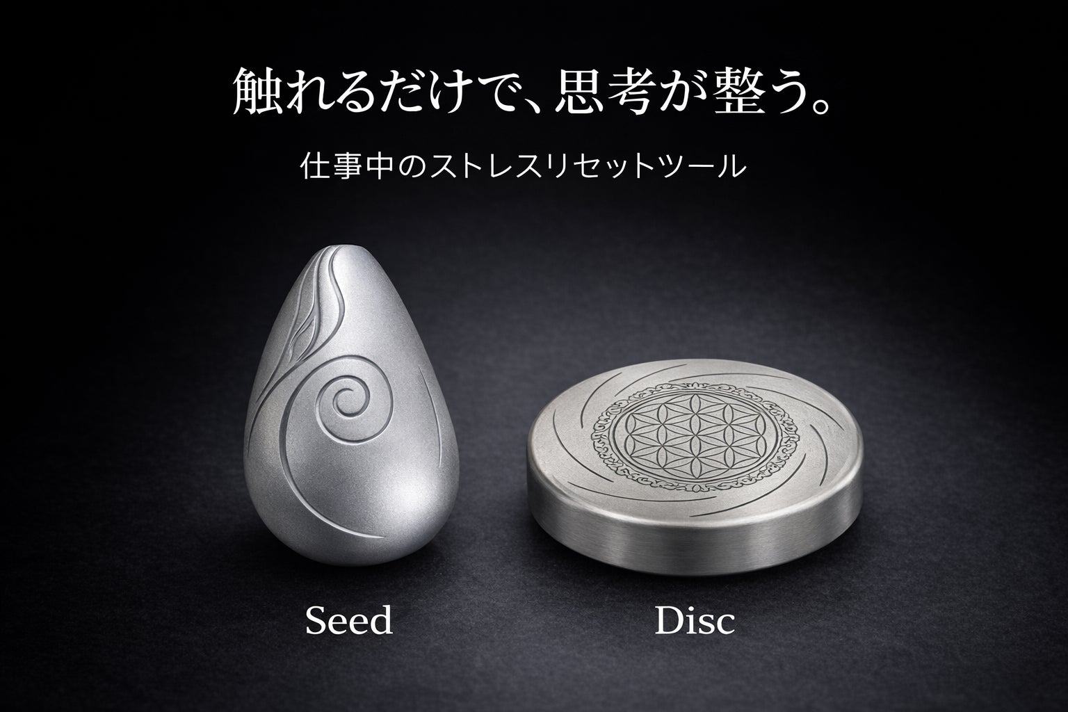 Meditation SeedとDiscは、単なるツールではなく、デスクアクセサリーやオブジェとしても楽しめます。金属削り出しならではの静かな存在感が、デスク空間を引き締め、美しく整えます。