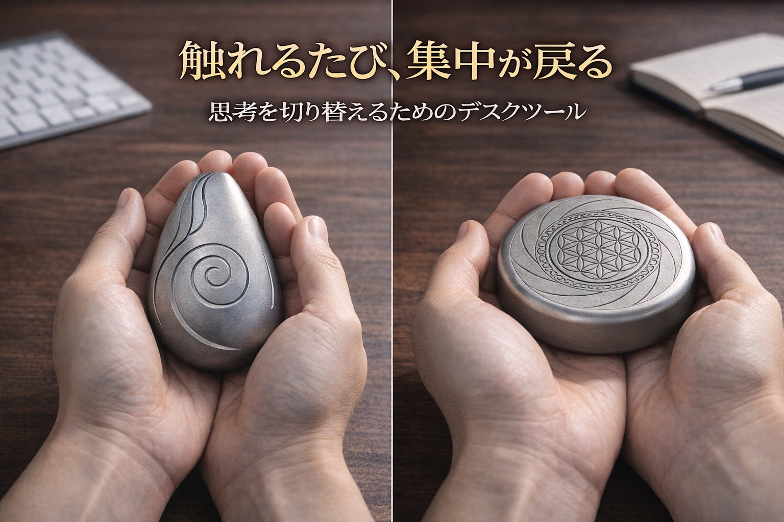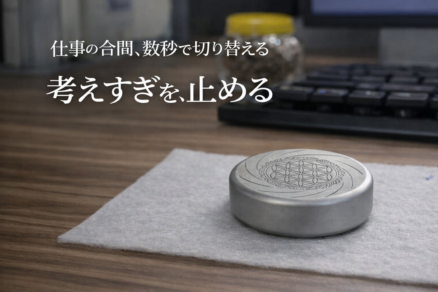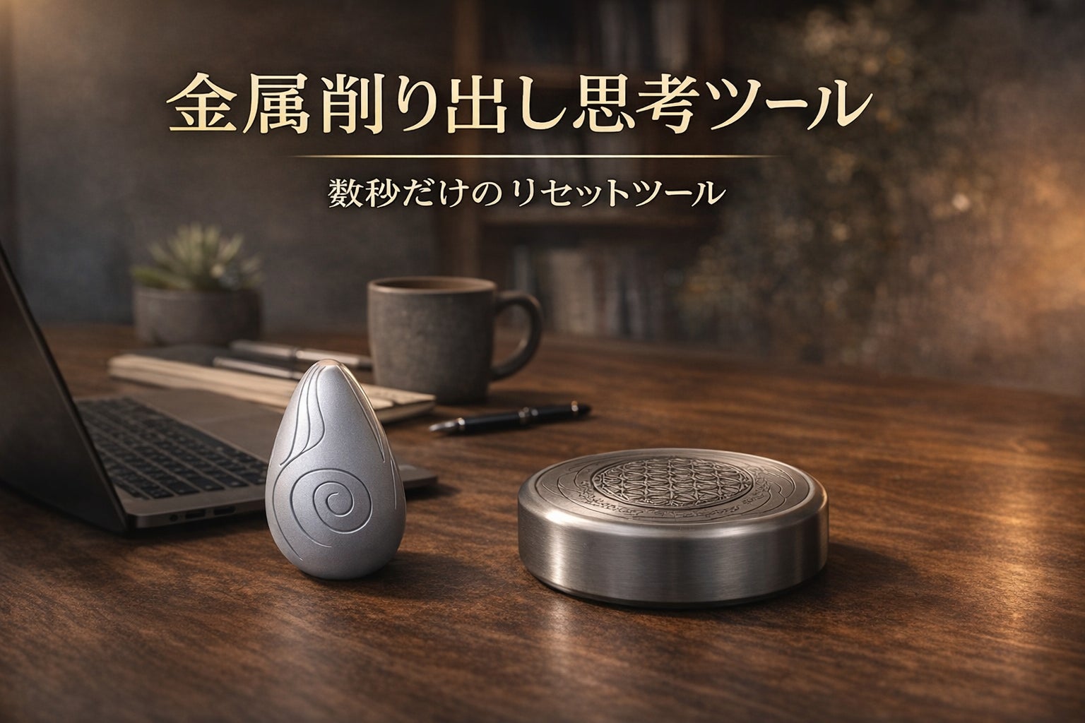 指先で触れることで思考を整えるための金属ツールです。忙しい日常の中で、数秒でも思考を止める時間を作るために設計されています。