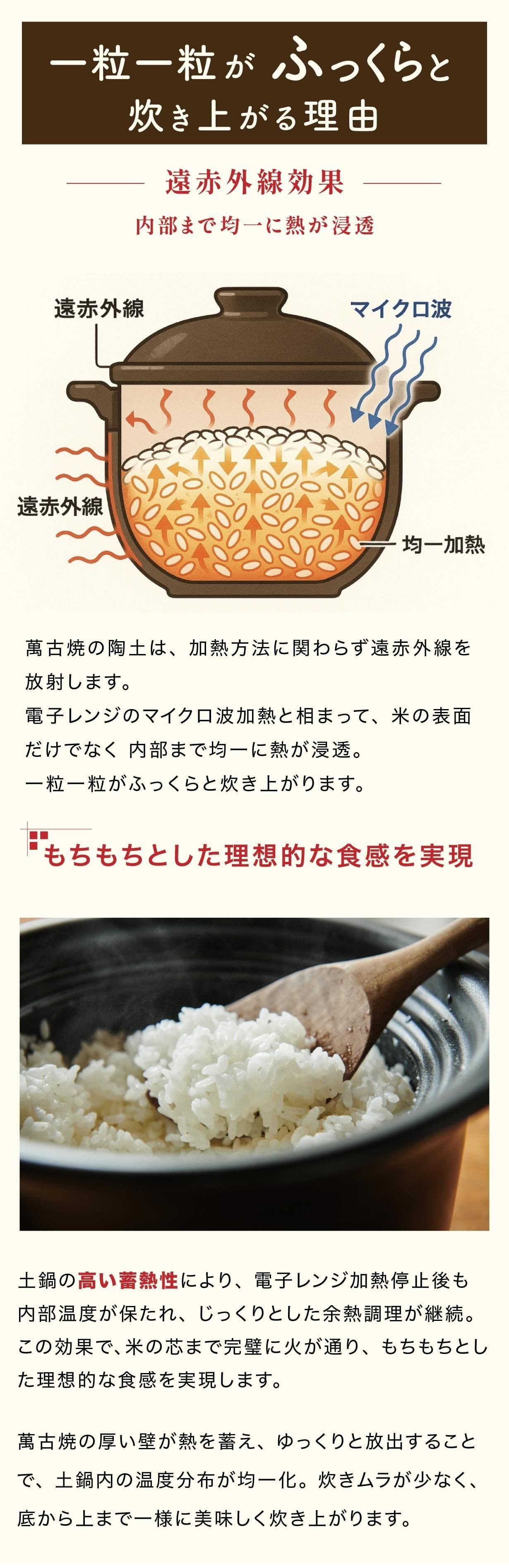 伝統の萬古焼技術により、 電子レンジでも本格的な土鍋炊飯を実現。