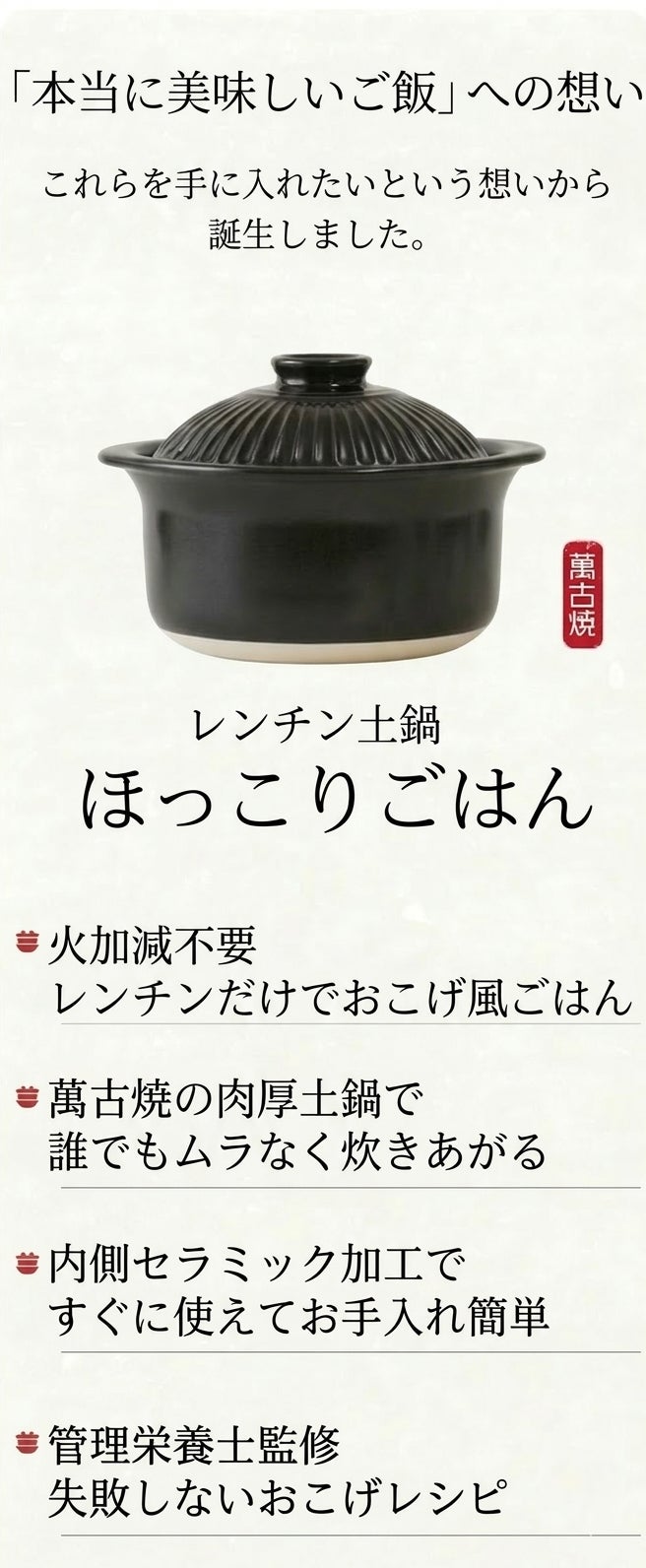 代表の私がまさにこの世代で、現代のアラフィフ世代は人生の転換期。子育て、介護、健康への不安、経済的な心配...でも、今までの経験を生かし、自分の心地よさを追求することもできる世代。だからこそ今が「第二の人生」を豊かにするチャンスだと思います。 私たちは40代・50代の方々が「人生後半戦を健康で心地よく生きる」ためのアイテムとサービスを研究・開発していきます。忙しい毎日の中でも、 美味しいごはんと懐かしいおこげの香りを 楽しめる「レンチン土鍋 ほっこりごはん」。