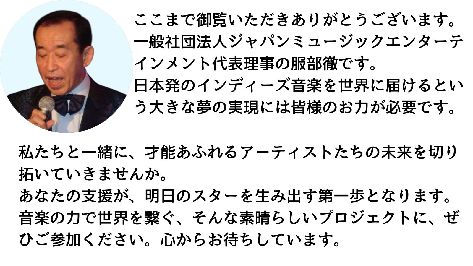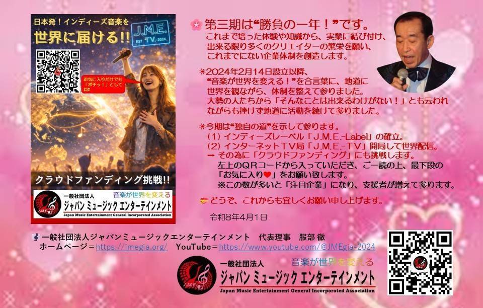 2026/04/01 12:162024年2月14日設立「一般社団法人ジャパンミュージックエンターテインメント 代表理事;服部 徹」です。幼い頃から大の音楽好きで、高校生時代に某大手音楽企業のコンテストで準優勝の経験もありますが…インターネット時代に入り、特に日本の音楽業界が世界的に遅れをとっています。私の残り人生を賭けて「世界に通じる音楽家や芸能人」を創造して行こうと思います。その為に今遣ることは「著作権管理団体になること」「世界に簡単に拡げられるインターネットテレビ局を作ること」「原盤権を持つレーベル事業を確保すること」が早道です。大学時代に民間放送局でアルバイトしていたし、起業した広告会社の経験も含め、資質あるクリエイターを発掘し、彼等の夢を叶えてあげることが大切だと思います。悟った頃には自己資金が乏しく、1・2期を通じて得た優秀な人財と共に、今回1,500万円のクラウドファンディングに挑戦します。数少ないスタッフやタレントさん達よりも、今は見ず知らずの方々にお願いした方が成功するのでは?と思い、ご支援とSNSを中心とした拡散をお願い致します。因みに私は鹿児島県霧島市出身の現在73歳です。まだまだ現役で頑張りますので、重ねてご支援の程、お願い申し上げます。 もっと見る
