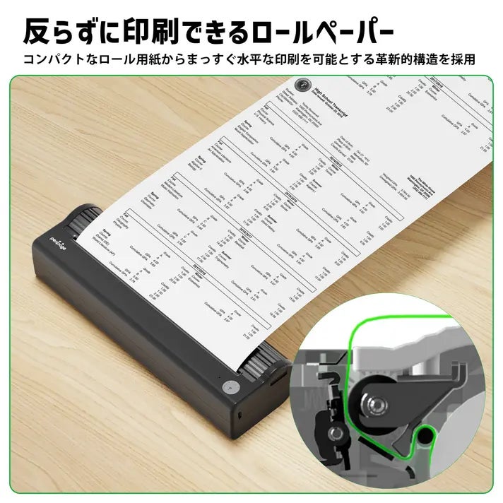 従来のポータブルプリンターの欠点は、用紙が曲がってしまうこと。