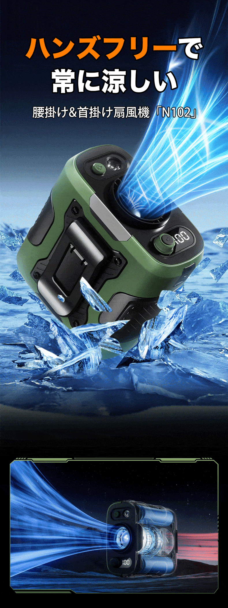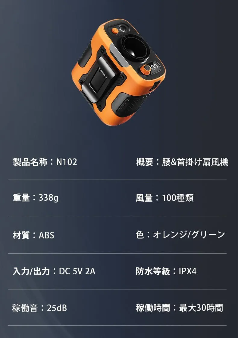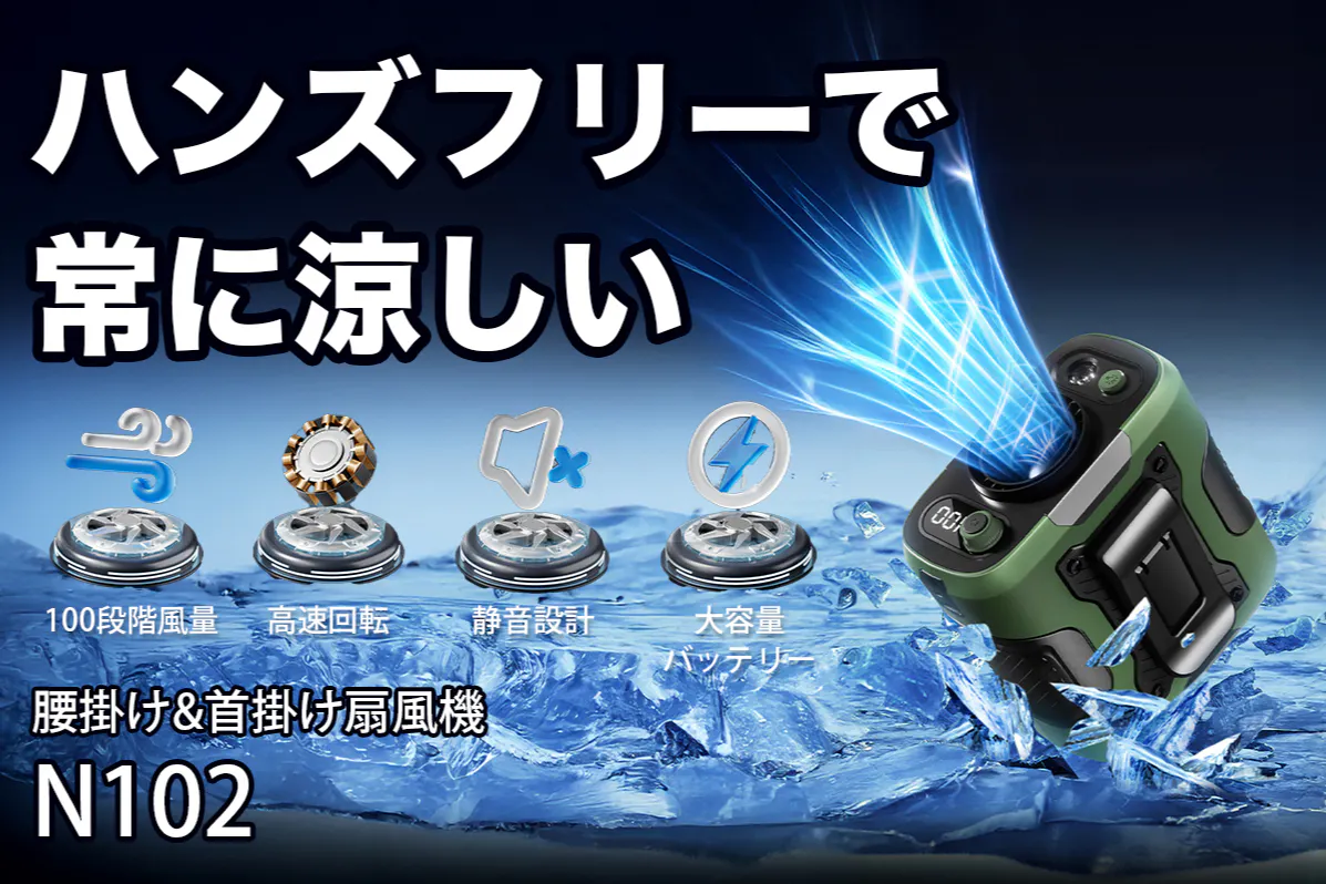 「N102」は腰や首に掛けるだけで、常に涼しい風を浴びることがき、暑い夏でも快適に過ごせます。