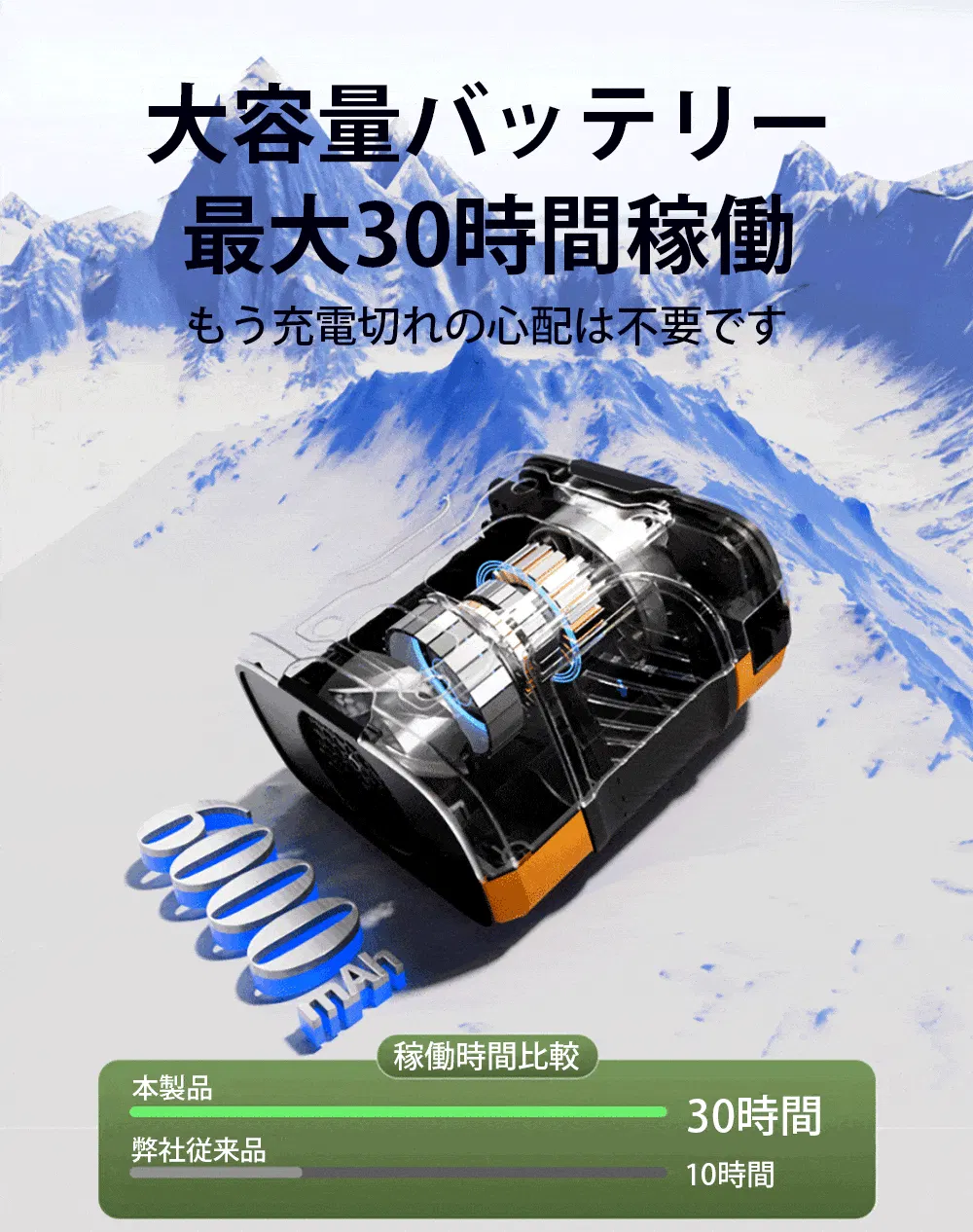 6,000mAhの大容量バッテリーを搭載しており、1回の充電で最大30時間連続使用できます。