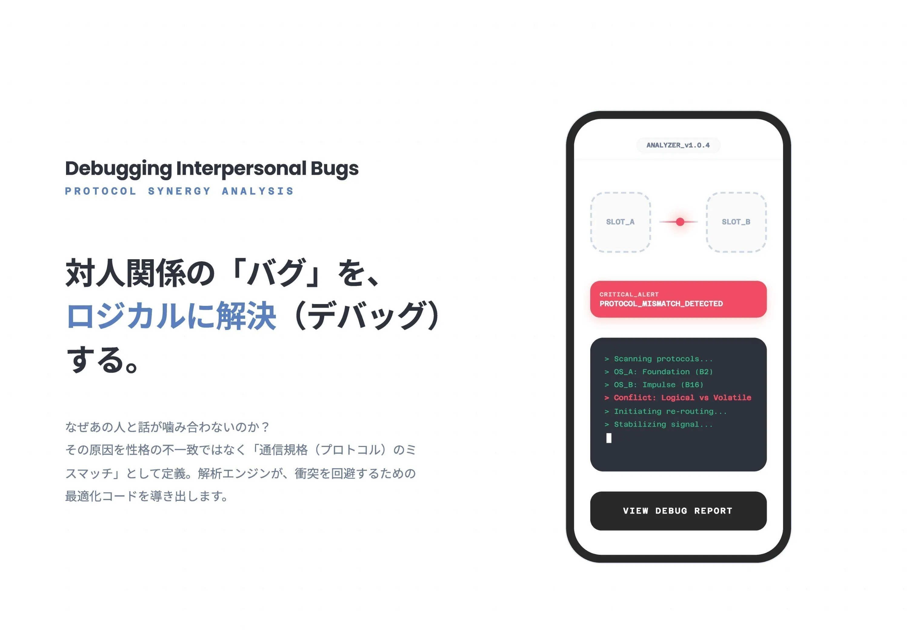 「自分はこういうデータを受け取り、こう処理して、こう出力する」という仕組みが明確になれば、他者との衝突も感情的に悩む対象ではなく、ロジカルに調整可能な「デバッグ作業」に変わります。お互いの仕様書を読み解きながら、パズルのように組み合わさって生きていける。そんな社会の実現が、私の根底にある想いです。