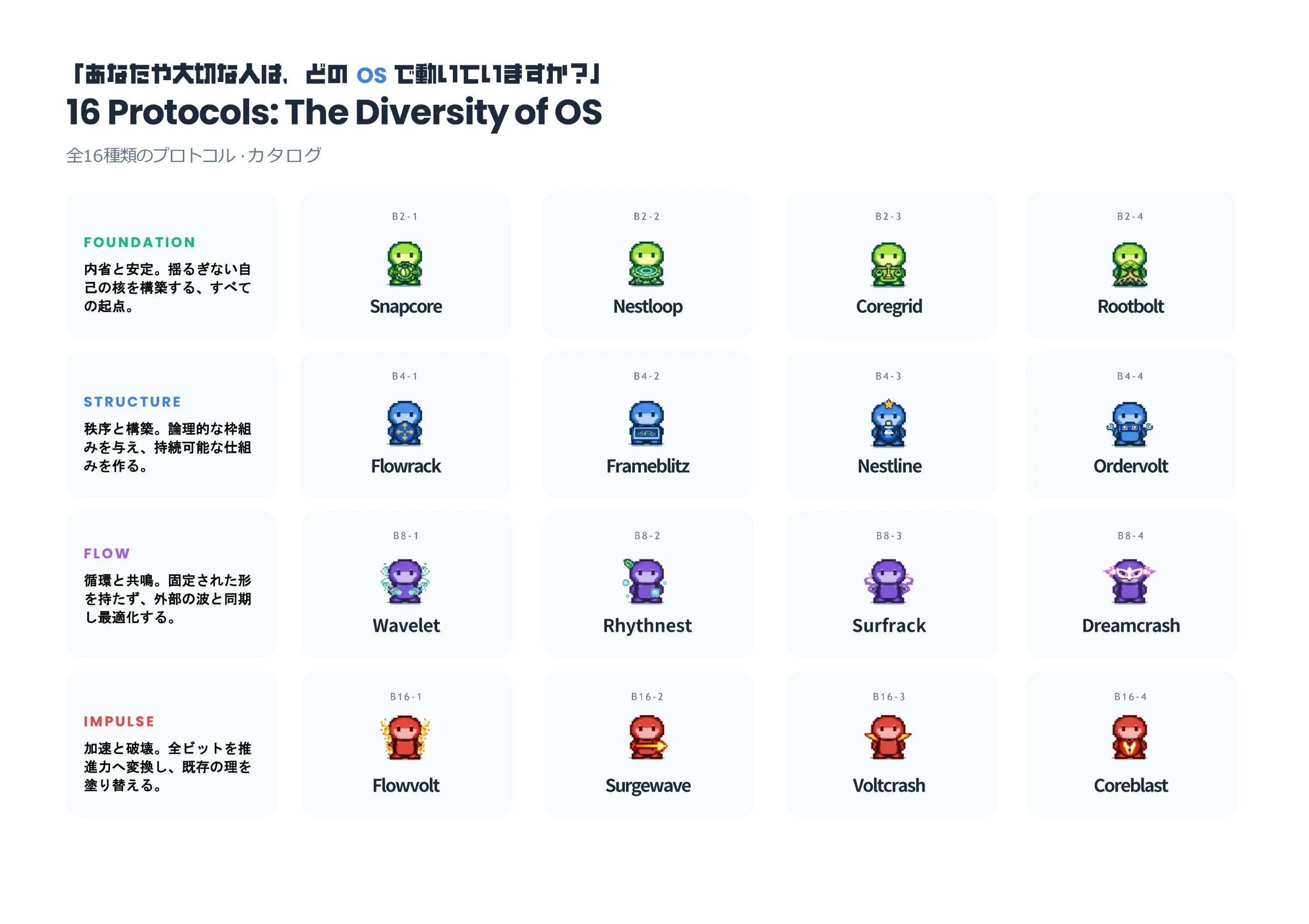 診断結果は、どこか懐かしくも新しい8bitのドット絵として出力されます。自分のプロトコル(仕様書)を「コレクションしたくなるデジタルアイテム」へと昇華させ、複雑な社会学の知見をポップに、そして美しく視覚化することに一切の妥協をしていません。