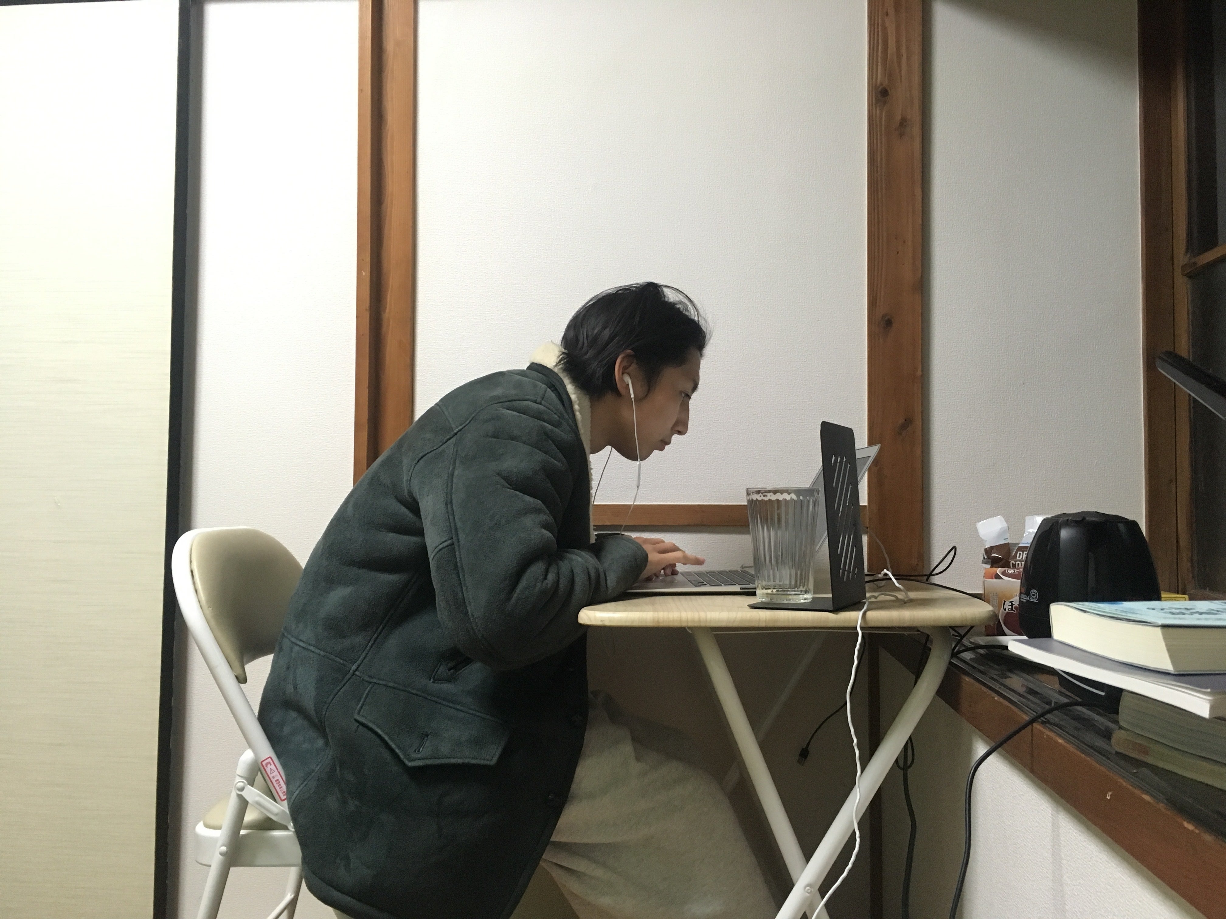 厚着をして自身運営するのメディア(とんぺいJ)の原稿を書くうめつ.いしい撮影