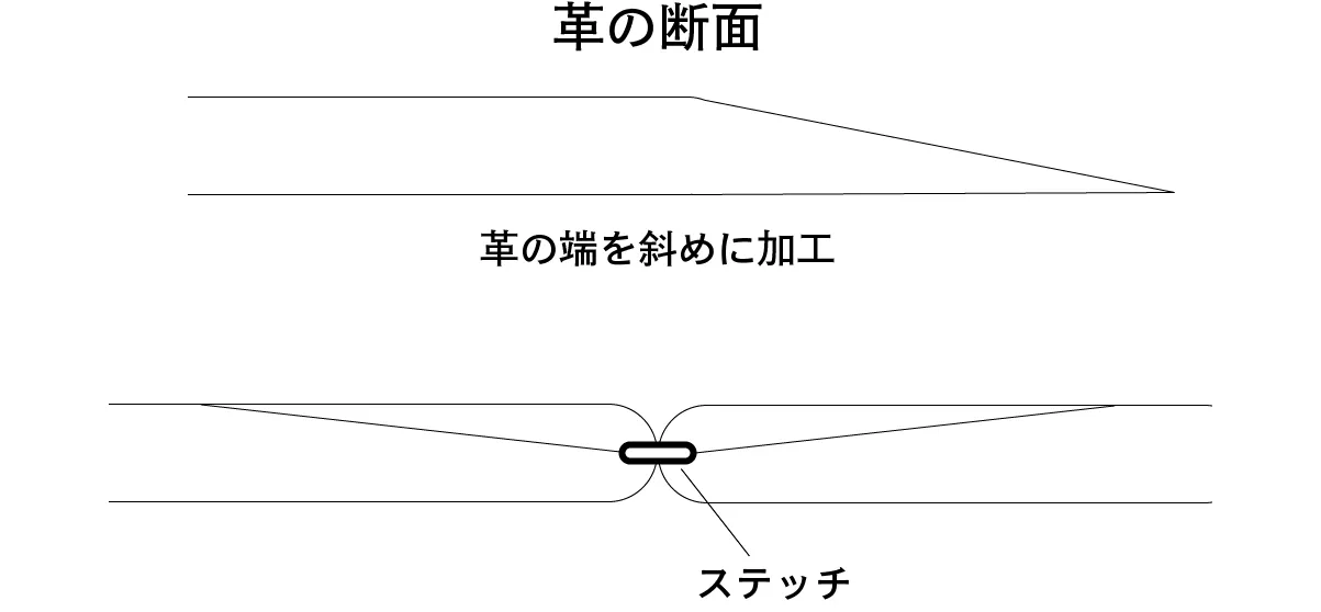 革を斜めに加工して縫い合わせることで、厚みを抑えつつ強度を確保。段差のないフラットな仕上がりにより、1ページ目から最後の一行までスムーズな筆記体験を実現しました。