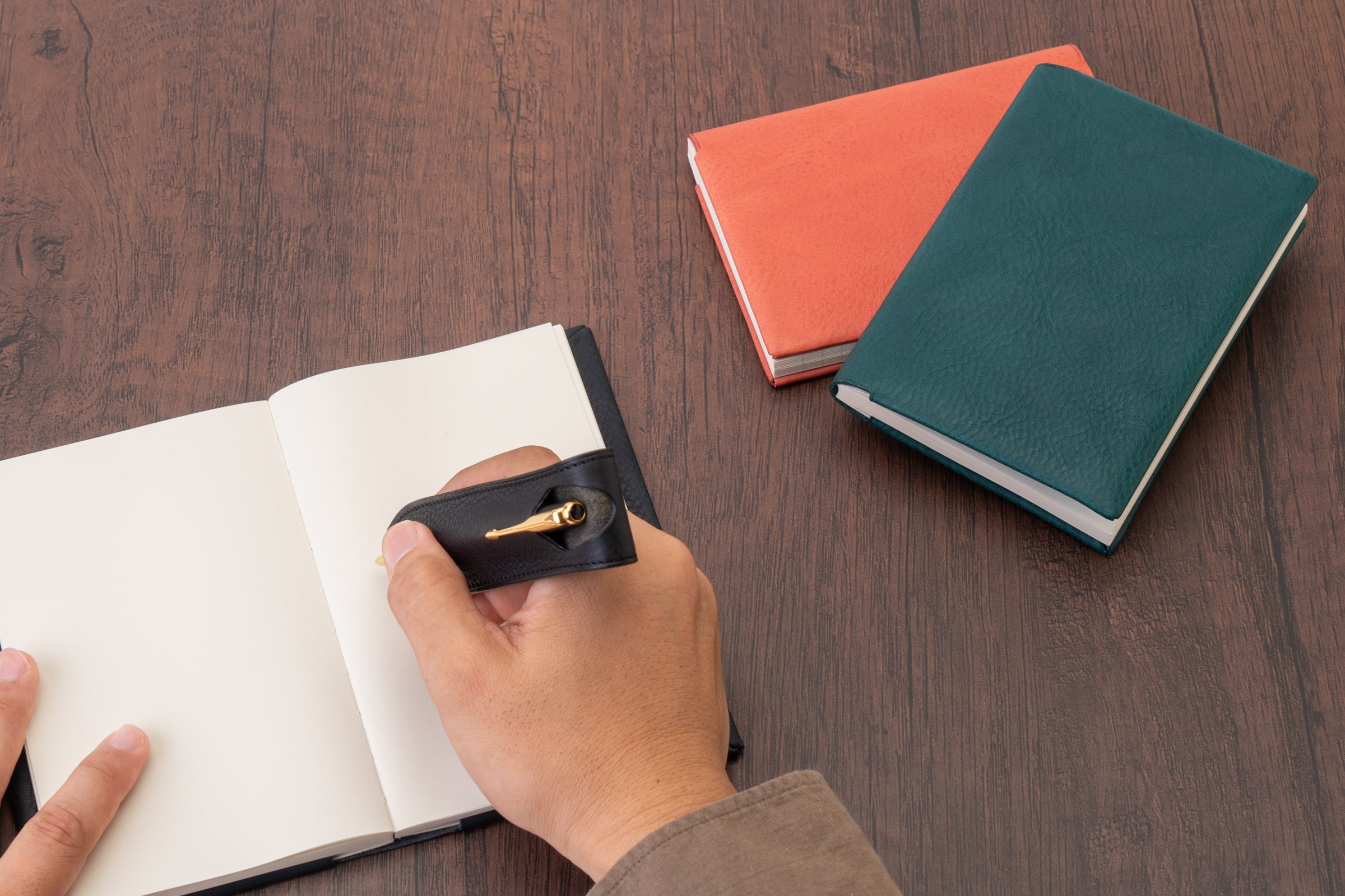 余計な装飾を排したミニマルデザイン。使うほどに育つイタリアンレザーの質感と、靴職人の技を応用した構造が生み出す上質な書き心地。