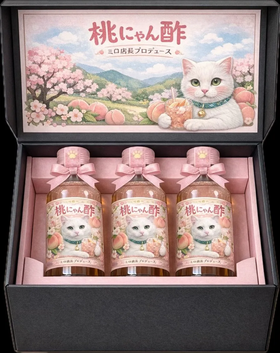 そして今回は、農園の看板猫『ミロ店長』が、桃のお酢ドリンク『桃にゃん酢』と、桃から作った『桃にゃんドリンク』をプロデュースしました。