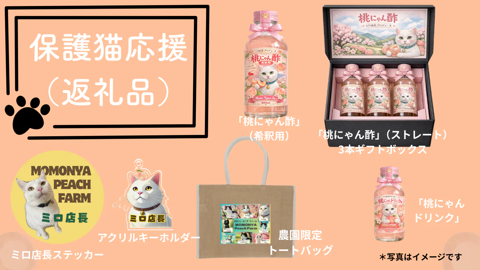 支援いただいた皆さんには、『桃にゃん酢』『桃にゃんドリンク』をはじめ、限定グッズなど、農園からの感謝の気持ちをお届けします。