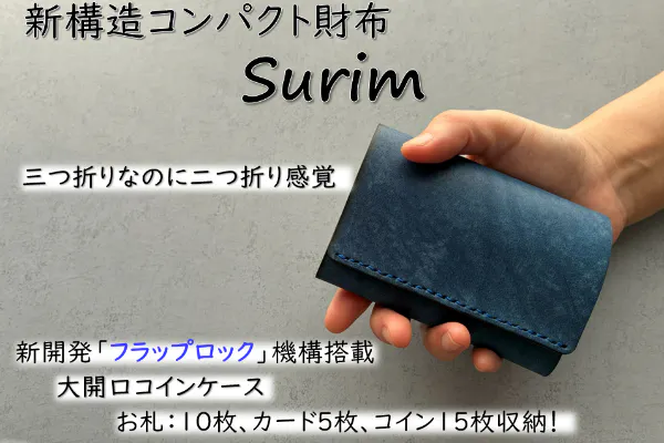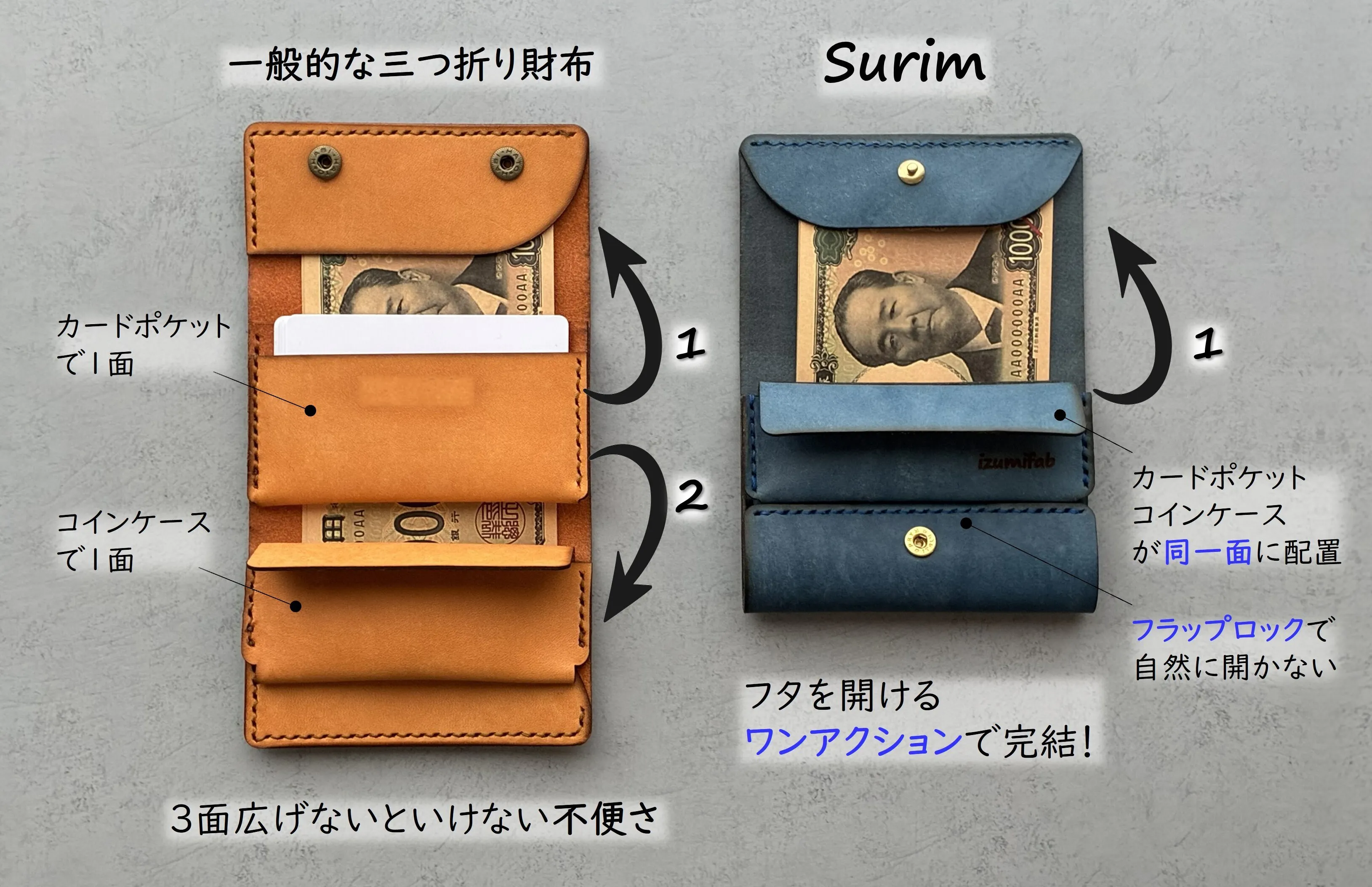 この作品の名前を考案する際、izumifabオリジナルコインケース「Gum」に代表されるお客様に愛着を持っていただけるようなizumifabらしいネーミングということで、畳んだ形状がかまぼこ板に乗っているかまぼこのようなアーチ形状であることから「Surim(スリミ)」と名付けました。おしゃれな名前も色々考えましたが、そこはやはりizumifabらしくこれまでの独自のネーミングセンスで送り出したいのです。(笑)