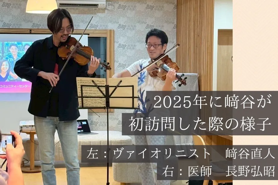 2024年7月、長野医師は在宅ホスピス「いきがいの家」を設立されて、2025年には﨑谷が初めてその場所を訪れ、患者様とご家族の目の前で演奏を行いました。
