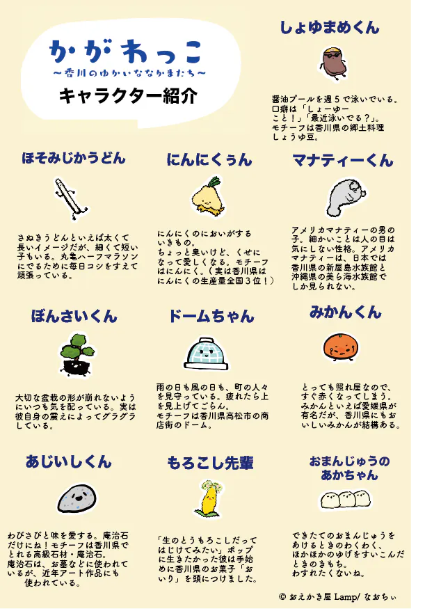 「かがわっこ」は、香川の「ええとこ(いいところ)」をぎゅっと詰め込んだキャラクターたちです。